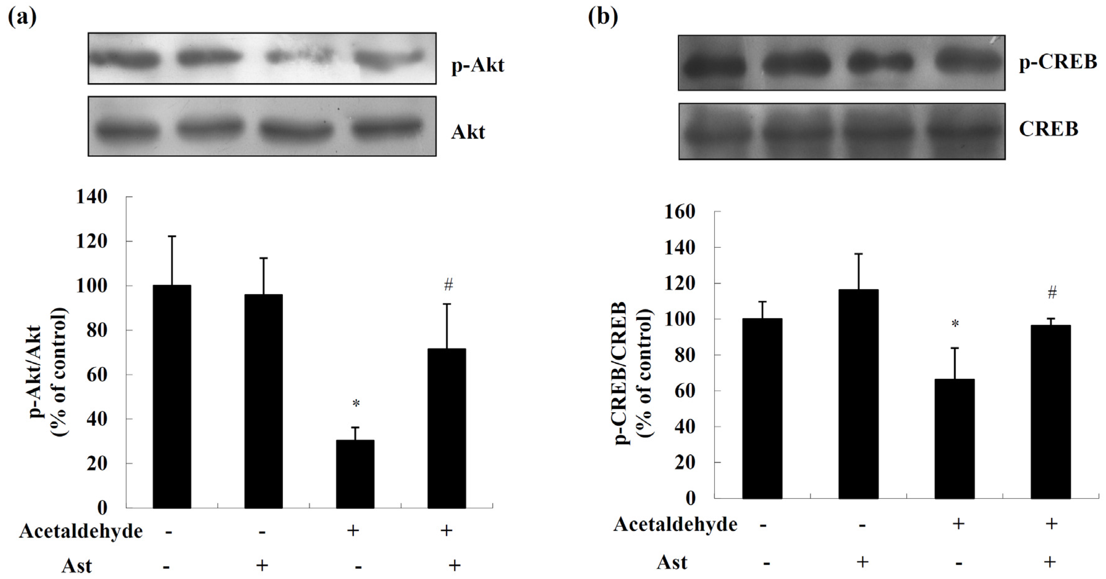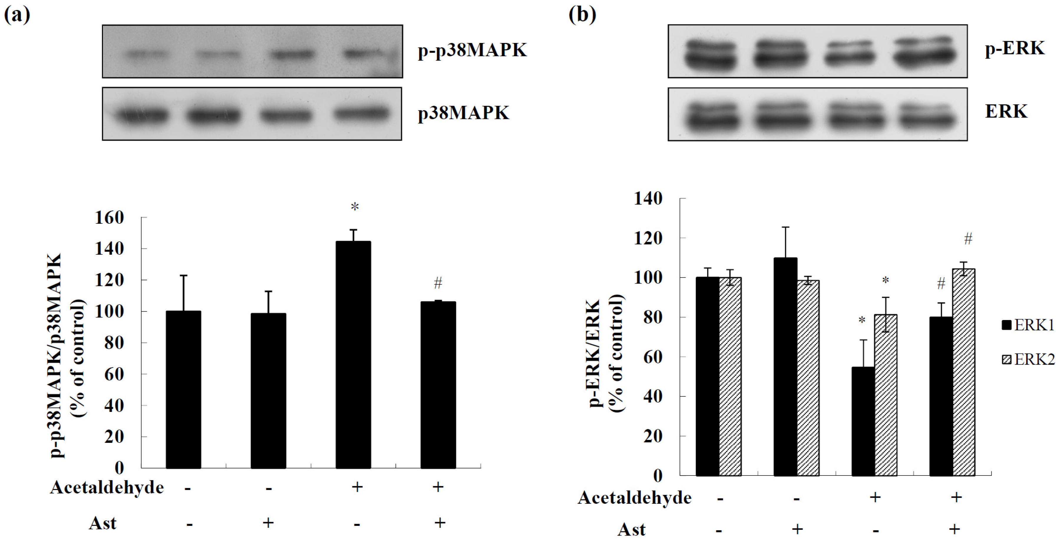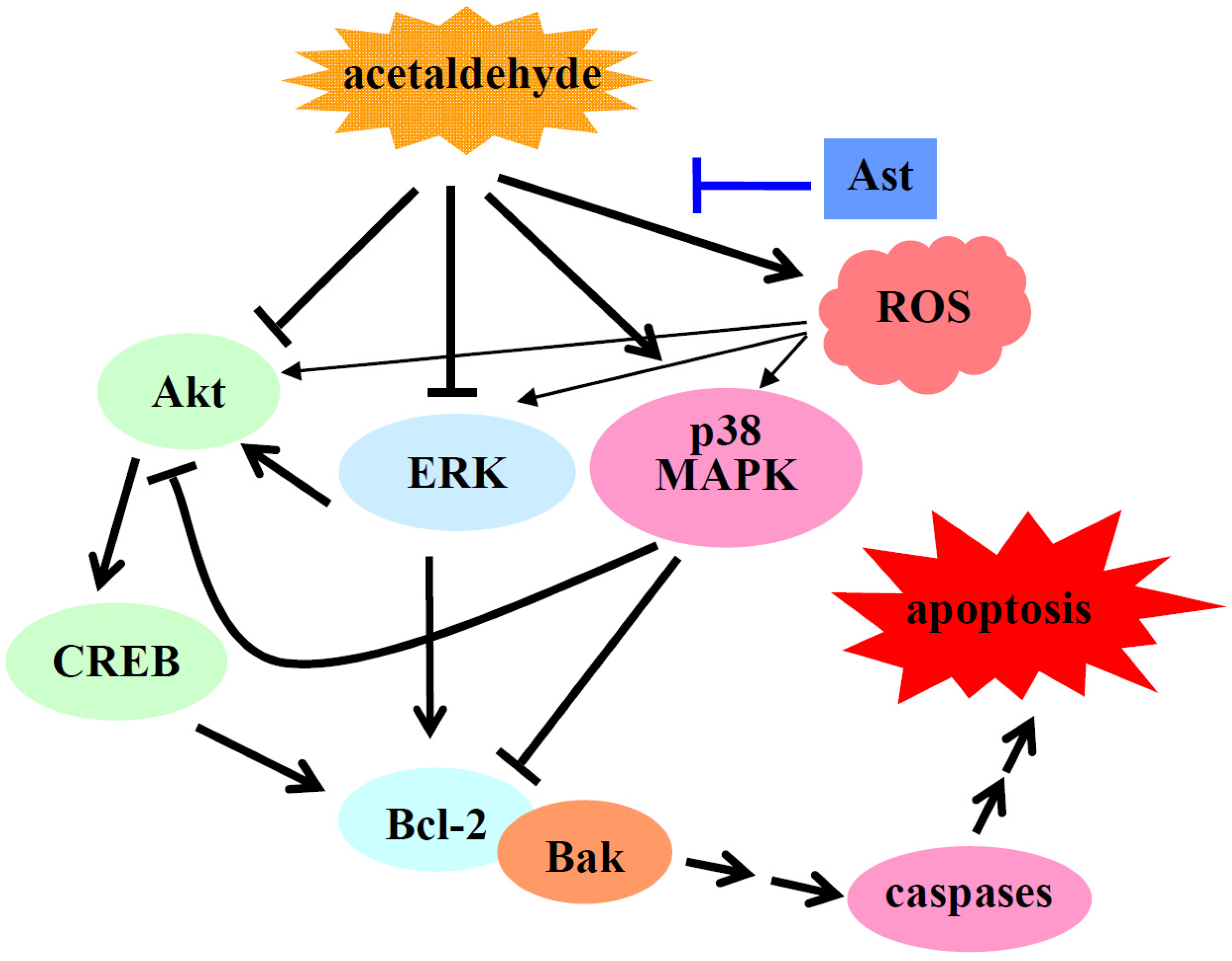 Overall, the results suggest that Ast may inhibit acetaldehyde-induced apoptosis and cytotoxicity by reducing the oxidative stress, preventing the activation of p38 MAPK, and attenuating the inhibition of ERK and Akt/CREB mediated cell signals in acetaldehyde-treated cells (Figure 6).