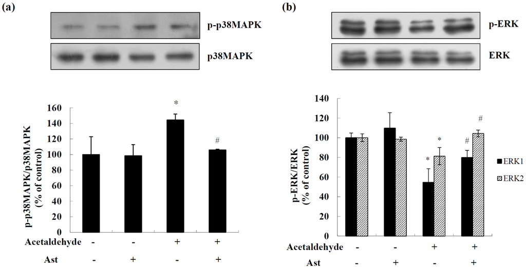 MAPKs have been shown to have important roles in promotion or inhibition of apoptosis. We next examined the effects of Ast on the activation of p38MAPK and ERK pathways in acetaldehyde-treated cells by Western blot analyses. Treatment of acetaldehyde dramatically increased the level of activated p38MAPK by approximately 44%, while Ast pretreatment for 24 h blocked this increase of activated p38MAPK, almost restoring it to the same level of that in control cells (Figure 4a). In contrast, acetaldehyde treatment caused a down regulation of the levels of activated ERK1 and ERK2 by approximately 46% and 19%, respectively, while Ast pretreatment significantly inhibited the increase of the level of activated ERK1 and ERK2, by 46% and 28%, respectively (Figure 4b). These data showed that Ast could block acetaldehyde-induced changes in the levels of activated p38MAPK and ERKs.