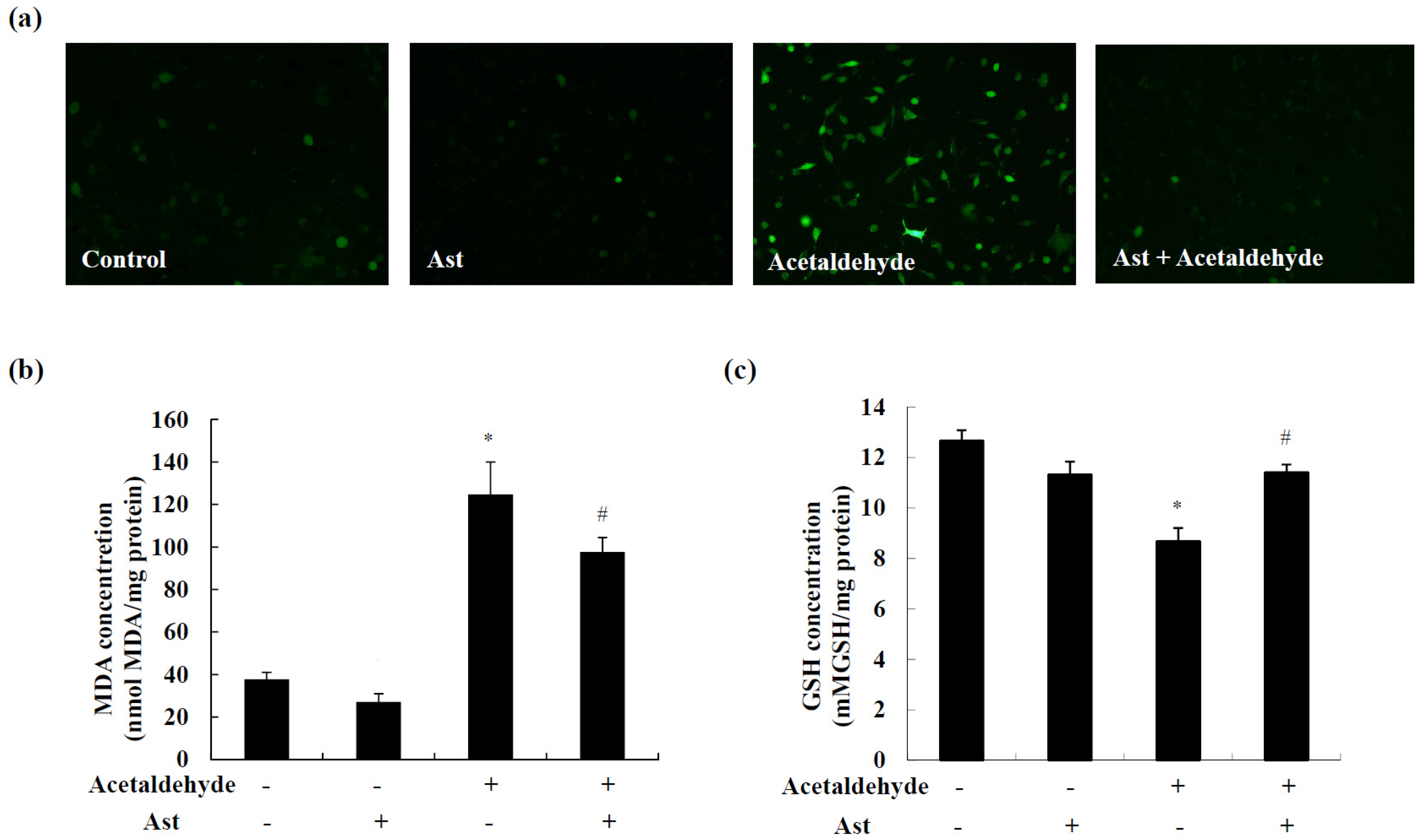 Effect of Ast on acetaldehyde-induced oxidative stress in SH-SY5Y cells. (a) Cells preincubated with vehicle or 50 ng/mL Ast were treated with 10 mM of acetaldehyde for 1 h. Cells were then stained with 2′,7′-dichlorodihydrofluorescin diacetate (DCFH-DA) to determine the production of ROS; (b) Cells preincubated with vehicle or 50 ng/mL Ast were treated with 10 mM acetaldehyde for 24 h. MDA production was measured in the cell lyates; (c) Cells preincubated with vehicle or 50 ng/mL Ast were treated with 5 mM of acetaldehyde for 2 h. The levels of reduced GSH were determined in the cell lyates. Values are means ± SD from three independent experiments. * Significantly different from control group (p < 0.05); # significantly different from acetaldehyde-treated group (p < 0.05).