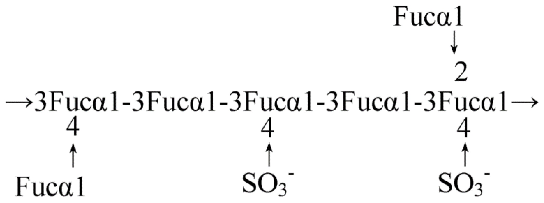Model for the average structure of fucoidan from Fucus vesiculosus. The core region of the fucan is composed primarily of a polymer of α (1-3) linked fucose with sulphate groups substituted at the 4 position on some of the fucose residues [35].