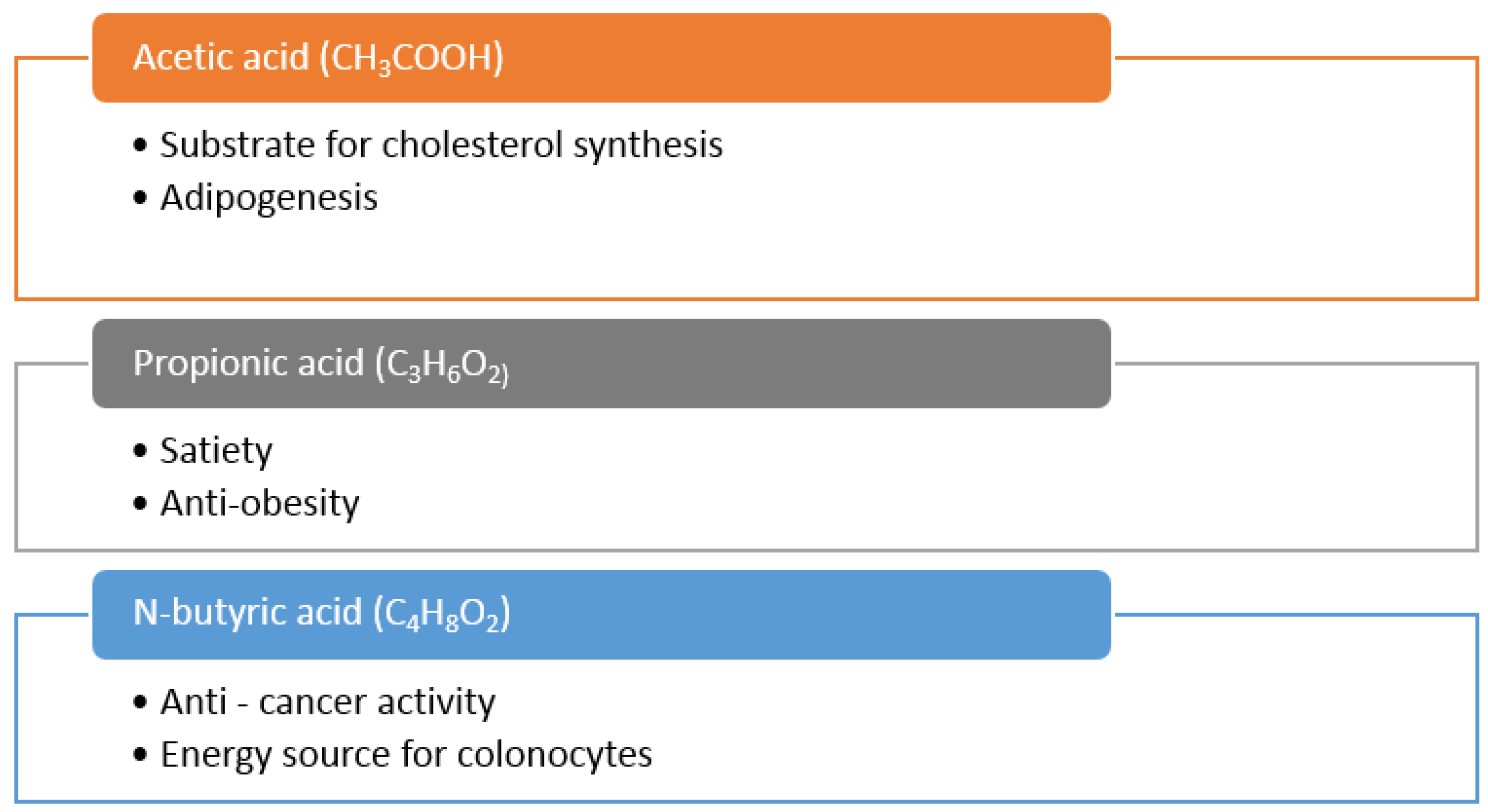 Putative health benefits of the three main short chain fatty acids (SCFAs), acetic acid, propionic acid and N-butyric acid. SCFA are mainly produced by the endogenous gut microbiota through the fermentation of undigested dietary fibres from the diet.