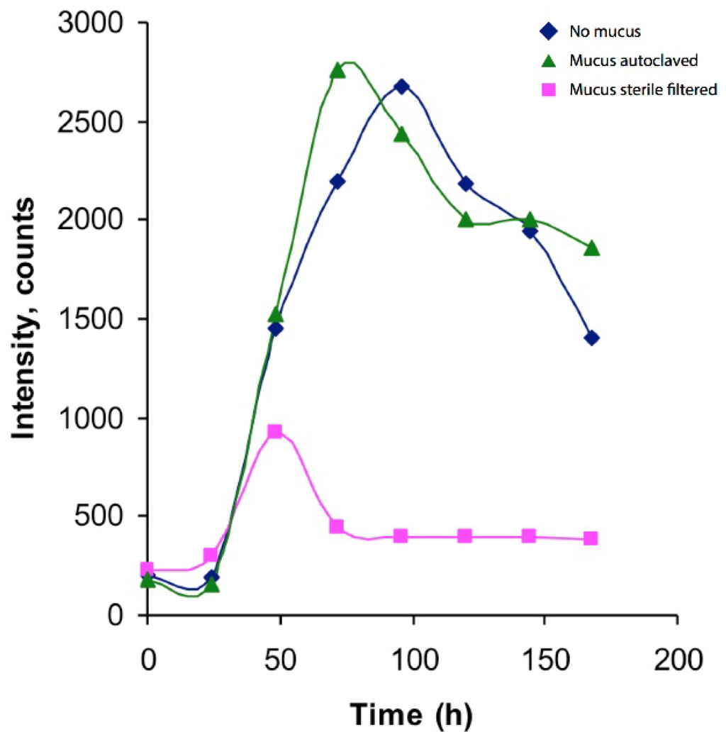 Production profile of m/z 320.08. Blue line represents Vibrio culture without addition of L. longissimus mucus, whereas green line represents Vibrio culture to which autoclaved mucus has been added, and pink line represents the Vibrio culture with sterile filtered mucus added. An increase of the m/z 320.08 compound is seen over the first 50 (sterile filtered), 80 (autoclaved) and 100 (control) hours, respectively, followed by a decline. The analyte does not appear to originate from the mucus but is rather a product of the Vibrio culture or medium. These results originate from duplicate injections of single culture samples.