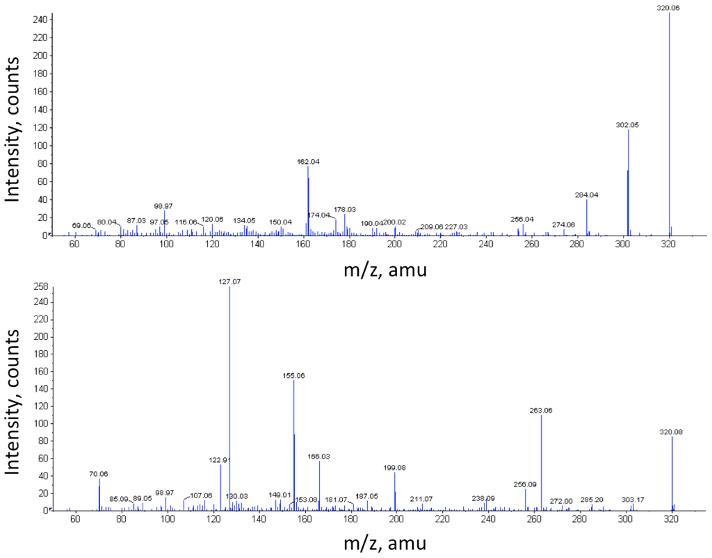 MS/MS spectra of TTX standard and the unknown compound with m/z 320.08. MS/MS spectra of the TTX standard (320.06; top) and the observed unidentified compound (320.08; bottom).