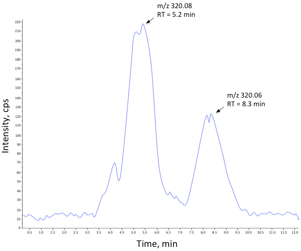 LC trace of the unknown compound with m/z 320.08 and TTX standard. Total ion count spectra (LC-MS/MS) demonstrating the difference in retention time between TTX (m/z 320.06; RT 8.3 min) and the unidentified compound (m/z 320.08; RT 5.2 min).