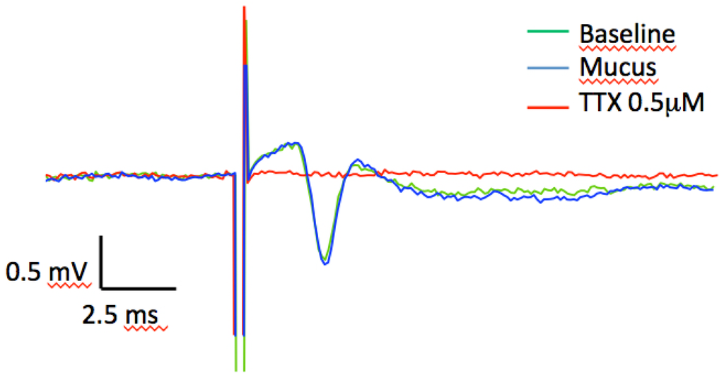 So, if the active compound is not TTX although the paralytic effect on shore crab is similar, is the effect mediated through TTX-sensitive ions channels? The most prominent feature of TTX is the capacity to block vertebrate sodium channels [25]. Hence, we tested the activity of the mucus in a rat hippocampal in vitro assay.