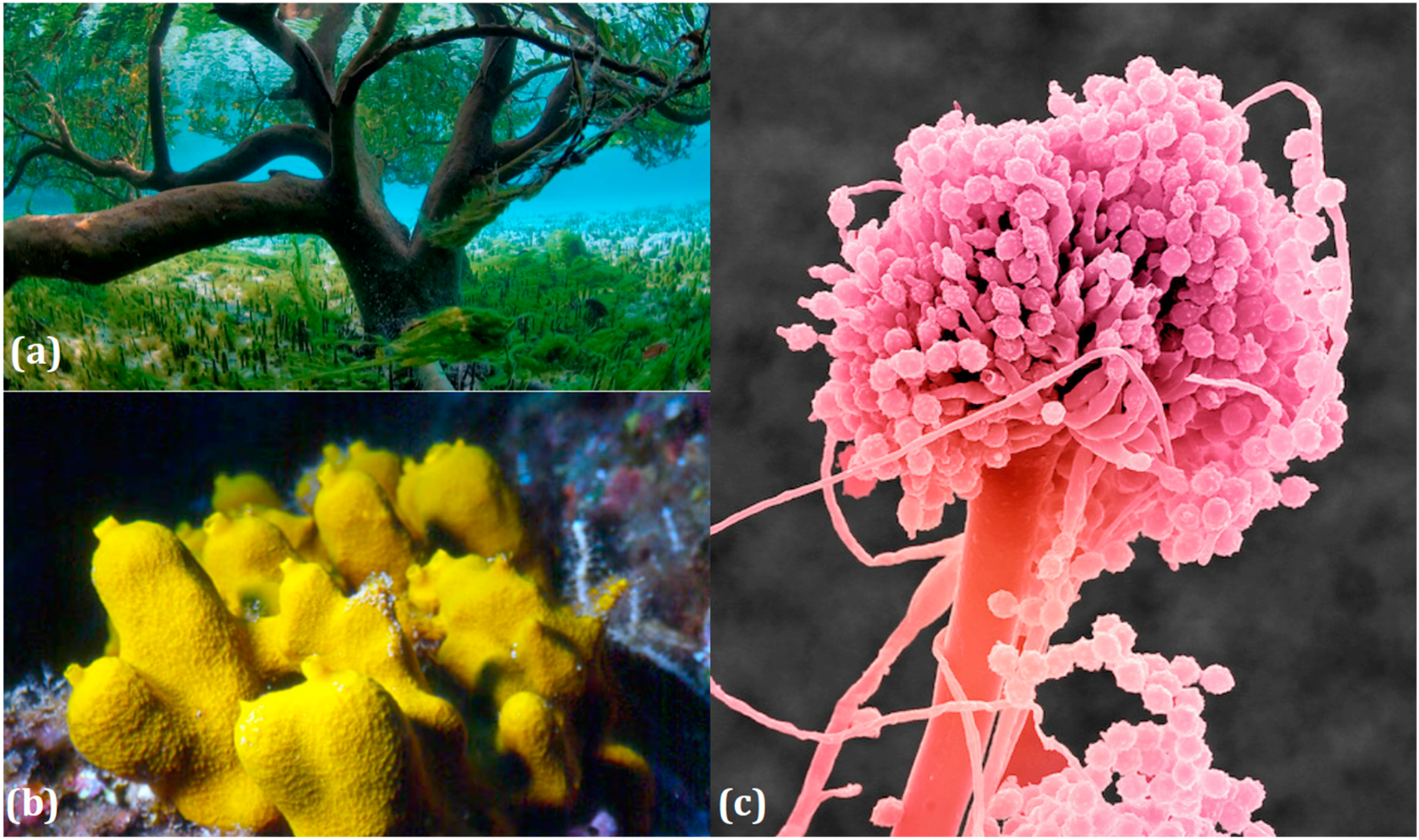 Marine habitats hosting fungal anthraquinones producers. (a) Tree and marine plants growing in a submerged area (b) Aplysina aerophoba (mediterranean sponge), usual host of endophytic filamentous fungi; (c) Aspergillus versicolor, exhibiting a pink pigment.