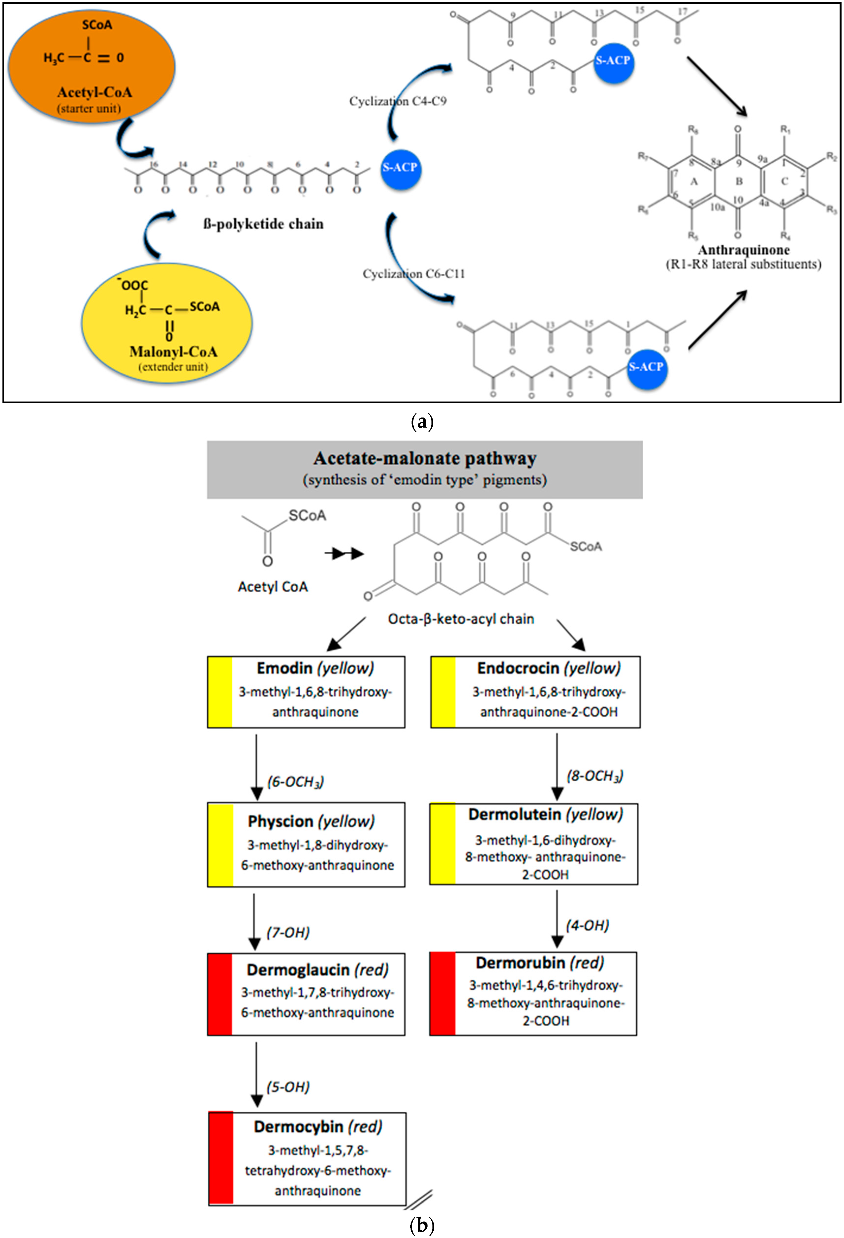 In fungi polyketide compounds are primarily synthesized by the acetate-malonate pathway (Figure 3), which is different from plants using shikimate pathways as well as acetate-malonate metabolism. Depending on the presence of acetate, malonate, or both components, according to the growth conditions, and to the strains involved, the numbers of each residue incorporated differ, and the final secondary metabolites as well. The involvement of each type of molecule can be studied through experiments using [13−14C-acetate] and [13−14C-malonate], ([141] and other authors such as Gessler et al. [17]. In relation to this acetate-malonate pathway, the biosynthetic relationships seem to form yellow hydroxyanthraquinones (e.g., emodin, physcion, and dermolutein) at the beginning of the pathway (simple structures), whereas the red ones, such as dermorubin or dermocybin, with more complex structures, certainly occur in the latter part of the biosynthesis pathway [16].