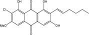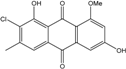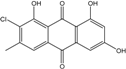 Caloplaca, Collema, Collemopsidium, Lichina, Ochrolechia, Ramalina, Tephromela, Verrucaria, and Xanthoria species are frequent among lichenic maritime populations [125]. They are known, in marine as in terrestrial biota, to be frequent producers of the common physcion (parietin). This anthraquinoid compound is excreted by Xanthoria aureola and X. parietina collected from exposed maritime rocks (South Norway) [126,127]. A high diversity of specific compounds can, however, be obtained from lichens, particularly in species producing chlorinated anthraquinones [76,96,128]. The production of special anthraquinones is a major characteristic of most species in the family Teloschistaceae (Caloplaca, Xanthoria, etc.) [72,77]. In the genus Xanthoria, and in closely related species of Caloplaca, antraquinoid molecules seem to be the only lichenic secondary compounds present [129,130]). The majority of species produce the widespread parietin and its chemical relatives, but also fragilin, emodin, and chloroemodin, accompanied by varying amounts of their oxydation products [128,129,131]. Caloplaca spp. isolated from calciferous rocks in Central Asia (C. schaereri; C. spitsbergensis, C. ehrenbergii, and other species) effectively produce 7-chlorocitreorosein and 7-chloro-1,6,8-trihydroxy-3-methyl-10-anthrone, as well as 7-chloroemodic acid, 7-chloroemodinal, and 1-O-methyl-7-chloroemodin, but also fallacinol (teloschistin) and fallacinal. Many of these compounds, widespread among lichens, are not found outside from the lichen′s group.