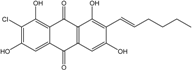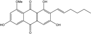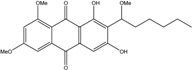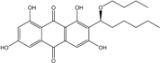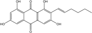 Trichoderma is a frequent genus among vegetal root-associated fungi (endophytes and symbionts). Few marine-derived strains have been identified, to date, as anthraquinoid producers. However, the frequent emodin, ω-hydroxyemodin, pachybasin, ω-hydroxypachybasin, 1-hydroxy-3-methoxyanthraquinone, 2-methylquinizarin, and chrysophanol were detected in Trichoderma aureoviride PSU-F95, cultured from a gorgonian sea fan Annella sp. [88]. This strain also produces the new trichodermaquinone (tetrahydroanthraquinone), the rare coniothranthraquinone, or isorhodoptilometrin. Trichoderma strains from terrestrial origin rather produce chrysophanol and pachybasin (personal data, [110]).