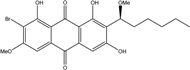 A marine-derived strain of Xylaria sp. 2508 produces a new compound, xylanthraquinone, along with three known anthraquinones, altersolanol A, deoxybostrycin, and bostrycin [95]. The Xylariaceae is one of the largest families of endophytic filamentous fungi isolated from plants material in terrestrial biotopes. There, they essentially grow under the form of mycelial structure, and their fruiting bodies (stromata) seem to form only when their host is stressed or diseased. However, the pigments seem to be mainly extracted from their fruiting stages [124]. Under marine conditions the morphological structures of fungi are not yet precisely described, and researchers suppose that fungi are mainly growing under mycelial structures. Nevertheless, this does not prohibit the synthesis of these anthraquinoid molecules.