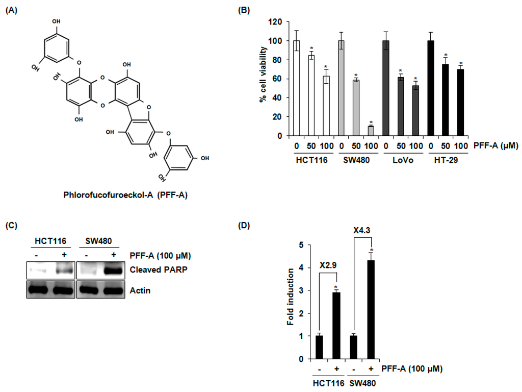 Molecular structure and the effect of phlorofucofuroeckol A (PFF-A) on cell viability and apoptosis in human colorectal cancer cells. (A) Molecular structure of PFF-A was shown; (B) human colorectal cancer cell lines such as HCT116, SW480, LoVo, or HT-29 cells were treated with PFF-A for 24 h. Cell viability was measured using 3-(4,5-dimethylthiazol-2-yl)-2,5-diphenyltetrazolium bromide (MTT) assay system and expressed as % cell viability. * p < 0.05 compared to cells without PFF-A; (C) HCT116 or SW480 cells were treated with 100 μM of PFF-A for 24 h. Cell lysates were subjected to sodium dodecyl sulfate polyacrylamide gel electrophoresis (SDS-PAGE) and Western blot was performed using antibodies against cleaved poly (ADP-ribose) polymerase (PARP) and actin; (D) for the ELISA analysis of cell death, the cytosol fraction was extracted from PFF-A-treated cells, and the cell death was measured using the Cell Death Detection ELISAPLUS Kit, and expressed as Fold induction of absorbance (A405–A490). * p < 0.05 compared to cells without PFF-A treatment.