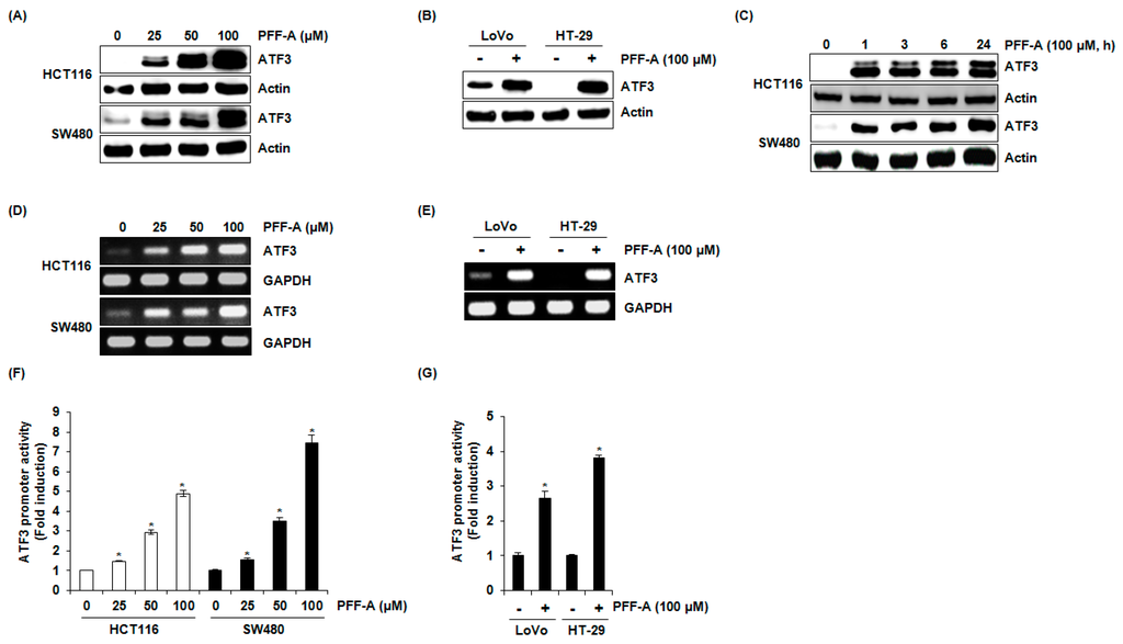As shown in Figure 2A,B, PFF-A dose-dependently increased ATF3 protein level in HCT116 and SW480 cells. In addition, PFF-A-mediated increase of ATF3 protein was observed in LoVo and HT-29 cells. In a time-course experiment (Figure 2C), ATF3 overexpression started to increase 1 h after PFF-A treatment in HCT116 and SW480 cells. To evaluate whether the increase of ATF3 protein by PFF-A contributed to transcriptional regulation, the level of ATF3 mRNA was measured. Similarly to the effect of PFF-A on the level of ATF3 protein, PFF-A amplified the expression of ATF3 mRNA in HCT116, SW480, LoVo, and HT-29 cells (Figure 2D,E). To confirm the effect of PFF-A on ATF3 transcriptional activation, the change of ATF3 promoter activity by PFF-A was tested. As shown in Figure 2F,G, ATF3 promoter activation by PFF-A treatment was observed in HCT116, SW480, LoVo, and HT-29 cells.