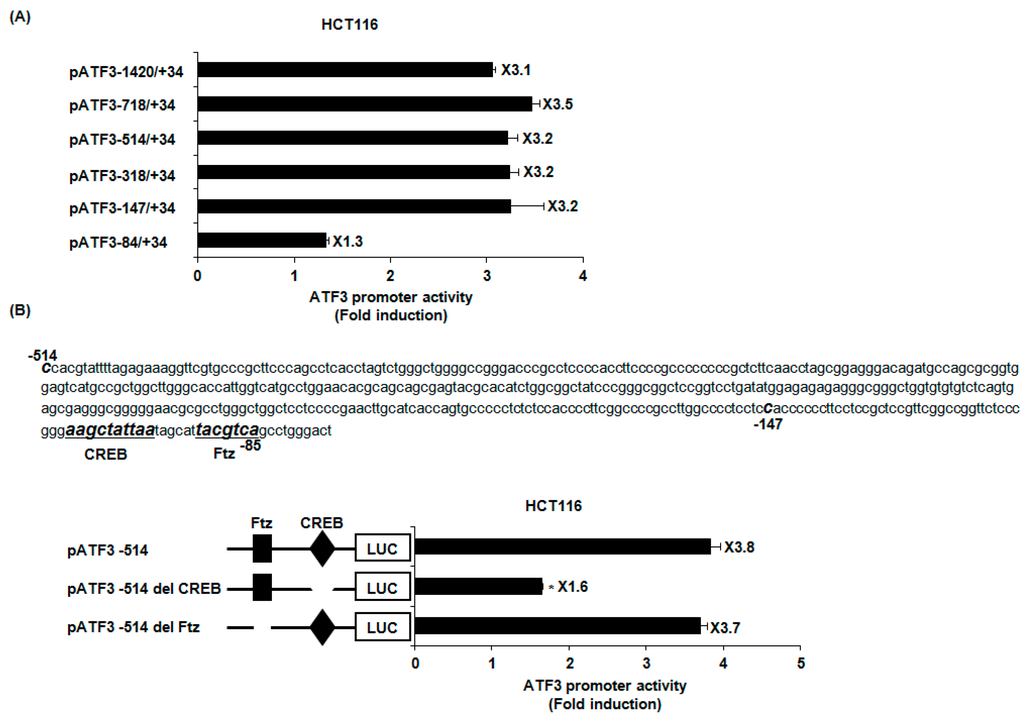 To search the specific ATF3 promoter region for ATF3 activation by PFF-A, ATF3 promoter activity was measured using different sizes of ATF3 promoter luciferase constructs (pATF3-1420/+34, pATF3-718/+34, pATF3-514/+34, pATF3-318/+34, pATF3-147/+34, and pATF3-84/+34). As shown in Figure 3A, PFF-A treatment resulted in an increase of promoter activity. The fold induction was 3.1, 3.5, 3.2, 3.2, 3.2, and 1.3 in pATF3-1420/+34, pATF3-718/+34, pATF3-514/+34, pATF3-318/+34, pATF3-147/+34, and pATF3-84/+34, respectively. Because fold inductions of luciferase activities by PFF-A were lowest in cells transfected with pATF3-84/+34, the promoter region of ATF3 at −147/−85 may be responsible for PFF-A-induced ATF3 activation. The Fushi tarazu (Ftz) and CREB have been reported to be cis-acting elements in ATF3 promoter containing −147 to −85 []. To identify the role of each cis-acting element, each site-deleted ATF3 promoter construct was transfected into HCT116 cells and treated with 100 μM of PFF-A. As shown in Figure 3B, ATF3 promoter activity by PFF-A significantly decreased when the CREB site was deleted. However, the deletion of Ftz sites did not affect ATF3 promoter activity by PFF-A. These data indicate that CREB may be important for ATF3 promoter activation by PFF-A.