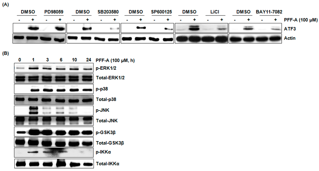Identification of the upstream kinases involved in phlorofucofuroeckol A (PFF-A)-mediated activating transcription factor 3 (ATF3) expression. (A) HCT116 cells were pretreated with PD98059 (40 μM, ERK1/2 inhibitor), SB203580 (40 μM, p38 inhibitor), SP600125 (40 μM, JNK inhibitor), LiCl (20 mM, GSK3β inhibitor), or BAY11-7082 (10 μM, IKK-α inhibitor) for 2 h and then co-treated with 100 μM of PFF-A for 1 h. Cell lysates were subjected to SDS-PAGE and Western blot was performed using antibodies against ATF3 or actin; (B) HCT116 cells were treated with 100 μM of PFF-A for the indicated times. Cell lysates were subjected to sodium dodecyl sulfate polyacrylamide gel electrophoresis (SDS-PAGE) and Western blot was performed using antibodies against p-ERK1/2, total-ERK1/2, p-p38, total-p38, p-JNK, total-JNK, p-GSK3β, total-GSK3β, p-IKK-α, or total-IKK-α.