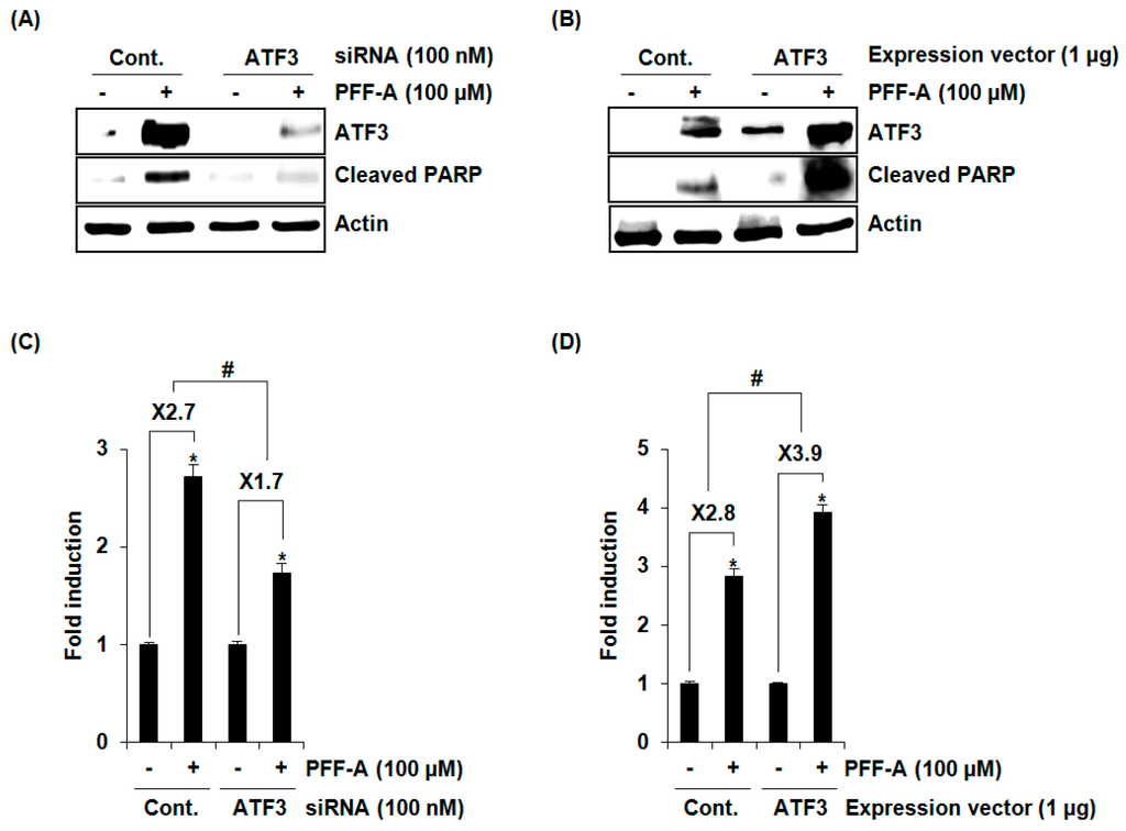 To evaluate whether overexpression of ATF3 by PFF-A affects apoptosis, Western blot against cleaved PARP was performed after ATF3 knockdown using ATF3 siRNA. As shown in Figure 5A, ATF3 knockdown attenuated PFF-A-mediated cleavage of PARP. To confirm the effect of ATF3 on apoptosis by PFF-A, ATF3 was overexpressed using an ATF3 expression vector and then cleaved PARP was measured using Western blot after PFF-A treatment. As a result (Figure 5B), PFF-A-mediated cleavage of PARP was aggravated in the cells transfected with an ATF3 expression vector compared with the cells transfected with a control expression vector. In addition, we confirmed the contribution of ATF3 to PFF-A-mediated apoptosis using a Cell Death Detection ELISAPLUS Photometric Enzyme Immunoassay Kit, and found that PFF-A-induced cell death was decreased by ATF3 knockdown by ATF3 siRNA and increased by ATF3 overexpression (Figure 5C,D). These findings indicate that ATF3 may be a key factor for apoptosis by PFF-A.