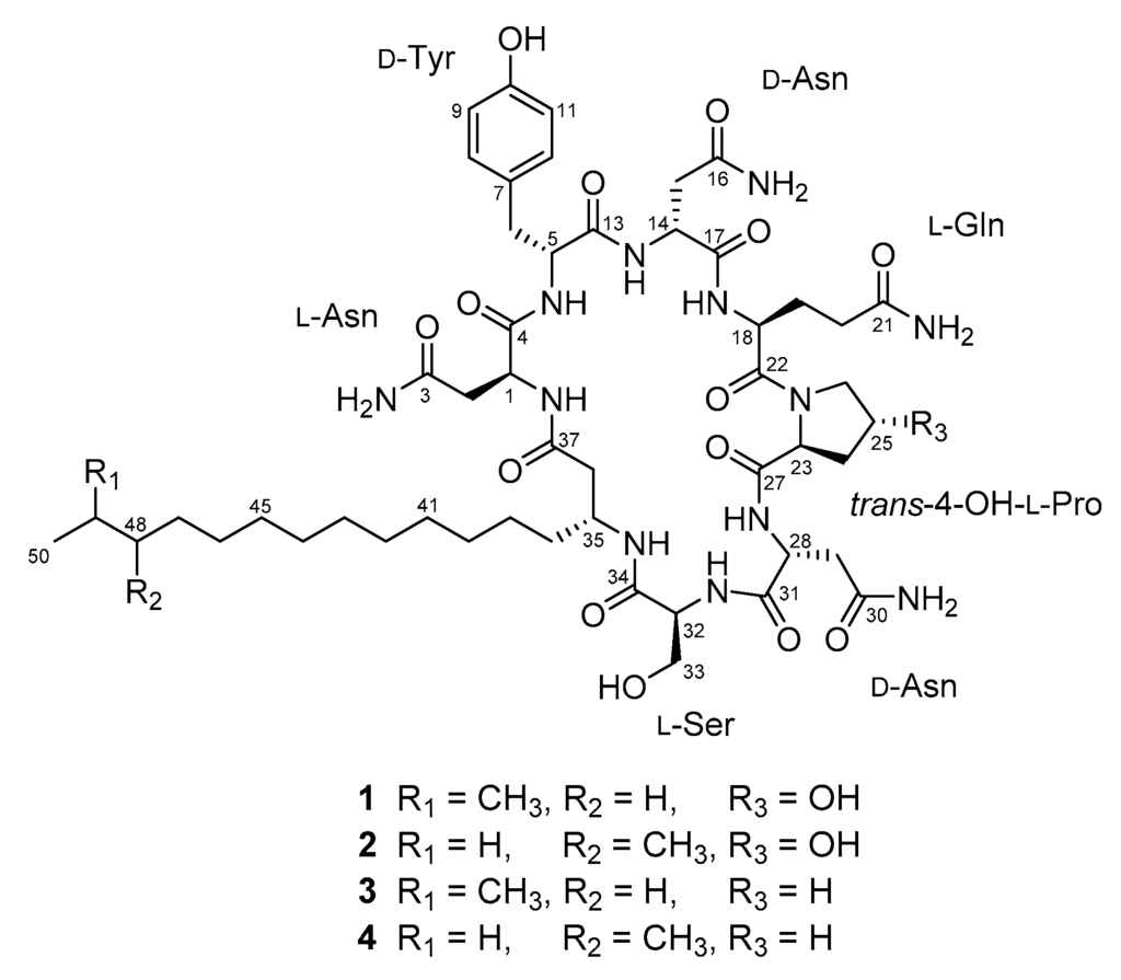 The exploration of biologically active secondary metabolites has provided a number of small molecules extremely useful as molecular probes and drug leads. However, the high probability of rediscovering known compounds with a conventional approach using readily accessible soil microorganisms emphasized the importance of studying untapped resources for novel chemistry []. Halophilic and halotolerant bacteria isolated from saline environments, such as oceans and saline lakes, have attracted the attention of natural product chemists [,]. It is primarily due to their unique adaptive strategies which could lead them to produce novel metabolites. Although salterns are a popular environment for studies on the physiology of halophilic and halotolerant microorganisms, they are also one of the least explored habitats for novel secondary metabolites. Several recent studies have revealed that microorganisms from salterns, mainly actinobacteria and fungi, produce various secondary metabolites with interesting bioactivities, and supported their metabolic potential [,,]. In an effort to discover new metabolites with pharmaceutical potential from halophilic and halotolerant bacteria, we performed chemical screening of extracts obtained from saltern-derived bacteria using a dereplication strategy based on public and in-house databases [,]. This investigation, followed by scale-up culture, solvent extraction and reversed-phase chromatography, resulted in the isolation of three new lipopeptides (1–3), together with known compound iturin A8 (4), from Bacillus sp. KCB14S006. Compounds 1 and 2 which incorporate 4-OH-Pro in the peptide backbone are considered the first members of the iturin class containing a modified amino acid. All the isolates were tested for their antimicrobial and cytotoxic activities, as well as their enzyme inhibition activities. We describe herein the bacterial cultivation, isolation, structural elucidation and biological activities of compounds 1–4.