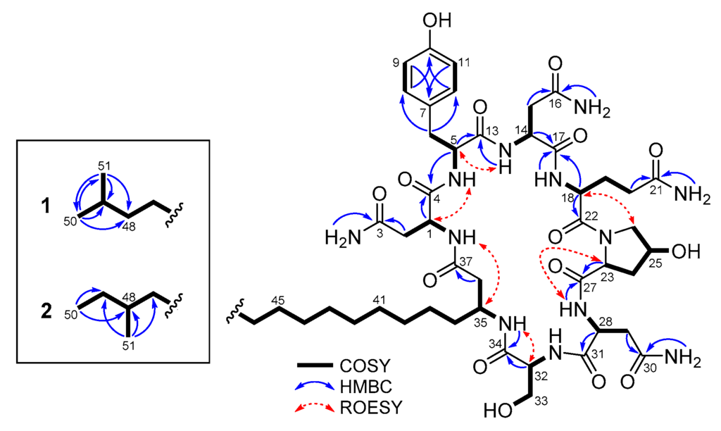Iturin F2 (2) was obtained as a white amorphous powder, whose molecular formula, which is the same as 1, was determined as C51H80N12O15 on the basis of HR-ESIMS in combination with the 1D NMR spectroscopic data (Table 1). Compared to the 1H and 13C NMR spectra of 1, noticeable differences were observed in the resonances for two methyls (δC/H 11.2/0.82 and 19.1/0.82). Further analysis of the 2D NMR spectroscopic data, including the crucial COSY correlations from the methyl H3-50 (δH 0.82) through the aliphatic methylene H2-49 (δH 1.24 and 1.09) and the methine H-48 (δH 1.27) to the methyl H3-51 (δH 0.82), readily confirmed that 2 contained an anteiso-type of β-amino fatty acid chain (Figure 2) []. This conclusion was also supported by HMBC correlations of two methyls H3-50 and H3-51 to the methine C-48 (δC 33.7) and the methylene C-49 (δC 28.9). Thus, the structure of compound 2, which is the positional isomer of 1, was determined as shown in Figure 1.