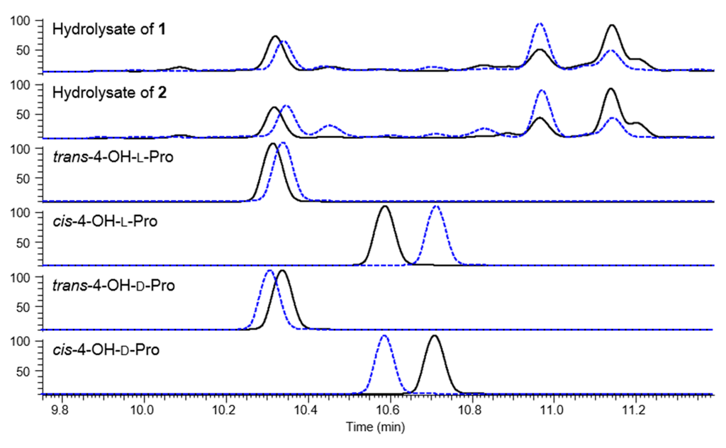 The stereochemistry of 1–3 was defined by MS-detected chromatographic comparison of the derivatives of the acid hydrolysate []. Advanced Marfey’s method using 1-fluoro-2,4-dinitro-phenyl-5-l/d-leucinamide (l- and d-FDLA) assigned the absolute configurations of the amino acid residues as l-Asn, d-Tyr, d-Asn (×2), l-Gln and l-Ser in 1–3 and l-Pro in 3 (Supplementary Information). Moreover, the absolute configurations of α- and γ-carbons of 4-OH-Pro residues in 1 and 2 were elucidated by chromatographic comparisons with FDLA derivatives of four standard residues (Figure 3). The FDLA derivatives of the 4-OH-Pro residue in 1 and 2 showed identical retention times to those of trans-4-OH-l-Pro, thus confirming 23S and 25R configurations.