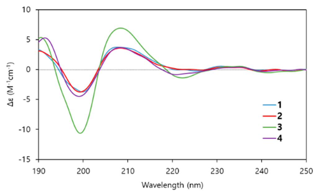 The absolute configuration at C-35 of the β-amino fatty acid chains in 1–3 was determined to be S on the basis of the elution order of the β-amino fatty acid chain derivatized with FDLA (Supplementary Information) [,]. The resulting configuration as 35R was in agreement with that of the known iturin class previously assigned by CD spectroscopy []. Next, differentiation of l-Asn and d-Asn in the sequence was suggested by means of a conformational analysis based on CD effects. The conformation of iturin A has been investigated by various techniques using NMR spectroscopy, energy calculations, IR and CD spectra [,]. Conformational studies based on CD spectra revealed that iturin A in trifluoroethanol showed two positive Cotton effects at 190 and 210 nm, and a negative Cotton effect at 198 nm. To confirm the stereochemical similarity between iturin A and compounds 1–3, CD spectra of these compounds in trifluoroethanol were measured and compared with that of iturin A in the literature. The CD spectra of 1–3 showed positive Cotton effects at 190 and 208 nm and a negative Cotton effect at 198 nm, and these are in very good agreement with those of iturin A (Figure 4). Thus, the absolute configurations of Asn1, Asn2 and Asn3 were determined to be l-, d- and d-Asn, respectively, which are the same as those of iturin A. In addition, the structure of compound 4 was established by spectroscopic data, Marfey’s analysis and CD spectra, and consequently determined to be iturin A8 bearing an anteiso-C17-type β-amino fatty acid chain [].