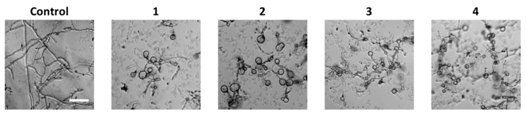Compounds 1–4 showed swelling morphology against P. oryzae. P. oryzae was treated with compounds 1–4 at the concentration of 3 µM. Representative images of morphological changes observed under a microscope at 48 h after treatment. Scale bars, 50 μm.