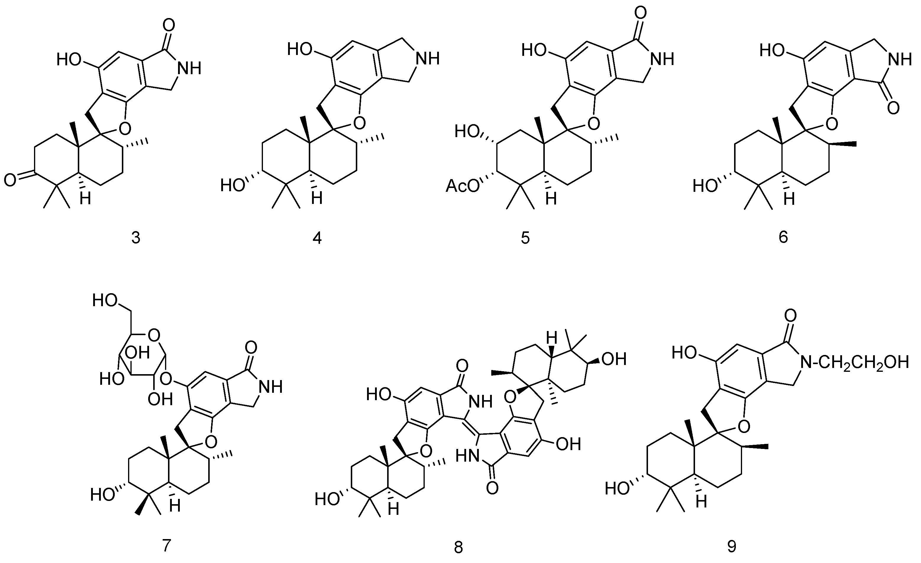Chemical examination of the solid culture of the endophytic fungus Stachybotrys chartarum isolated from the sponge Niphates recondita (Weizhou Island in Beibuwan Bay, Guangxi Province of China) resulted in the isolation of seven new phenylspirodrimanes, named chartarlactams (3–9). Compounds 3–9 exhibited potent lipid-lowering effects in HepG2 cells in a dose of 10 μM (Figure 2) [8].