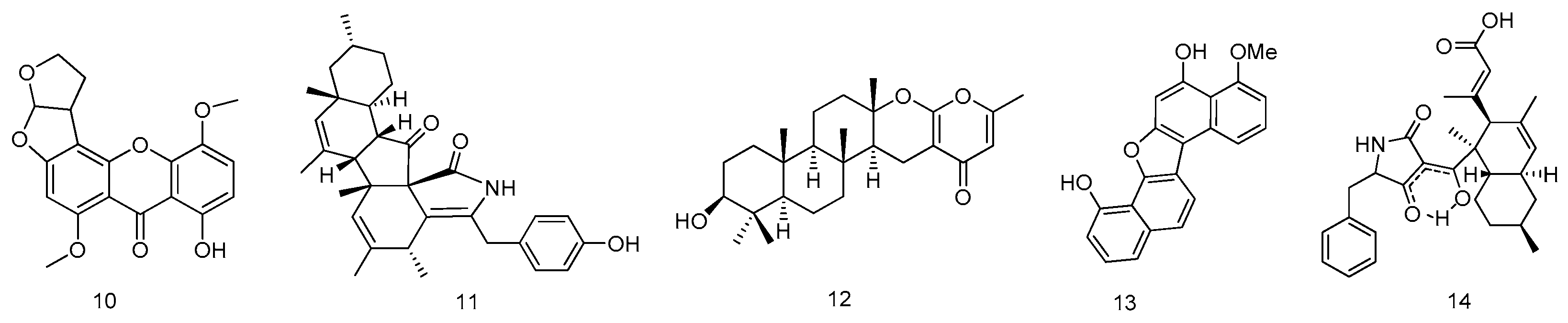 - Song, F.; Ren, B.; Chen, C.; Yu, K.; Liu, X.; Zhang, Y.; Yang, N.; He, H.; Liu, X.; Dai, H.; Zhang, L. Three new sterigmatocystin analogues from marine-derived fungus Aspergillus versicolor MF359. Appl. Microbiol. Biotechnol. 2014, 98, 3753–3758. [Google Scholar] [CrossRef] [PubMed]