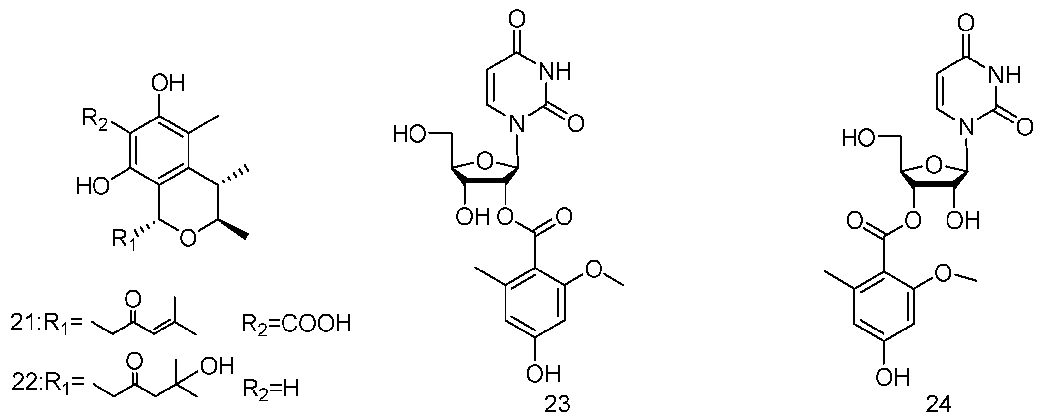 - Kornsakulkarn, J.; Saepua, S.; Komwijit, S.; Rachtawee, P.; Thongpanchang, C. Bioactive polyketides from the fungus Astrocystis sp. BCC 22166. Tetrahedron 2014, 70, 2129–2133. [Google Scholar] [CrossRef]