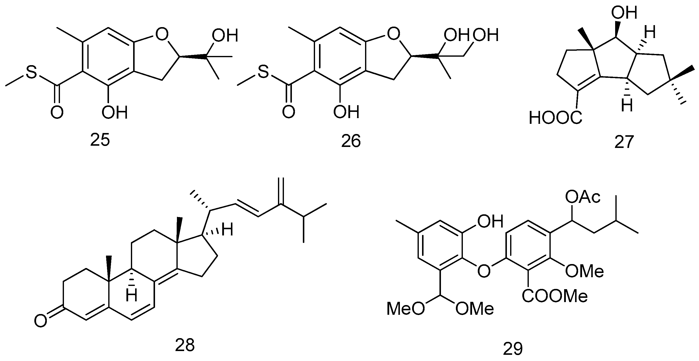 A novel isobenzofuranone derivative, pseudaboydins A (31) was isolated from the marine fungus, Pseudallescheria boydii, associated with the starfish, Acanthaster planci. Compound 31 showed moderate cytotoxic activity against HONE1, SUNE1 and GLC82 with IC50 values of 37.1, 46.5 and 87.2 μM, respectively (Figure 8) [23].