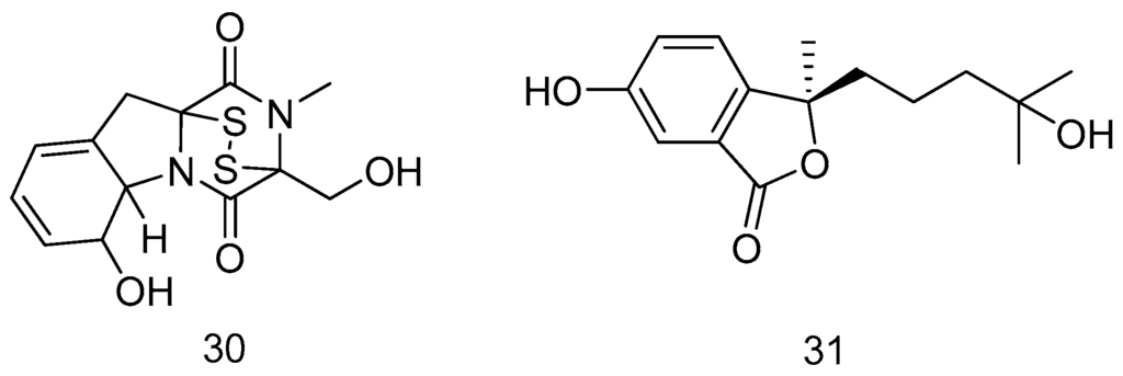 Liang et al. [22] investigated the influence on secondary metabolites with variety of cultivation parameters of marine fungus, Neosartorya pseudofischeri, which was isolated from the inner tissue of starfish Acanthaster planci. Glycerol-peptone-yeast extract (GlyPY) and glucose-peptone-yeast extract (GluPY) media were applied to culture this fungus. A novel gliotoxin (30) was produced with GluPY medium. Compound 30 displayed significant inhibitory activities against three multidrug-resistant bacteria, S. aureus (ATCC29213), MRSA (R3708) and Escherichia coli (E. coli) (ATCC25922), as well as cytotoxicities against some cell lines including human embryonic kidney (HEK) 293 cell line and human colon cancer cell lines, HCT-116 and RKO (a poorly differentiated colon carcinoma cell line) (Figure 8).