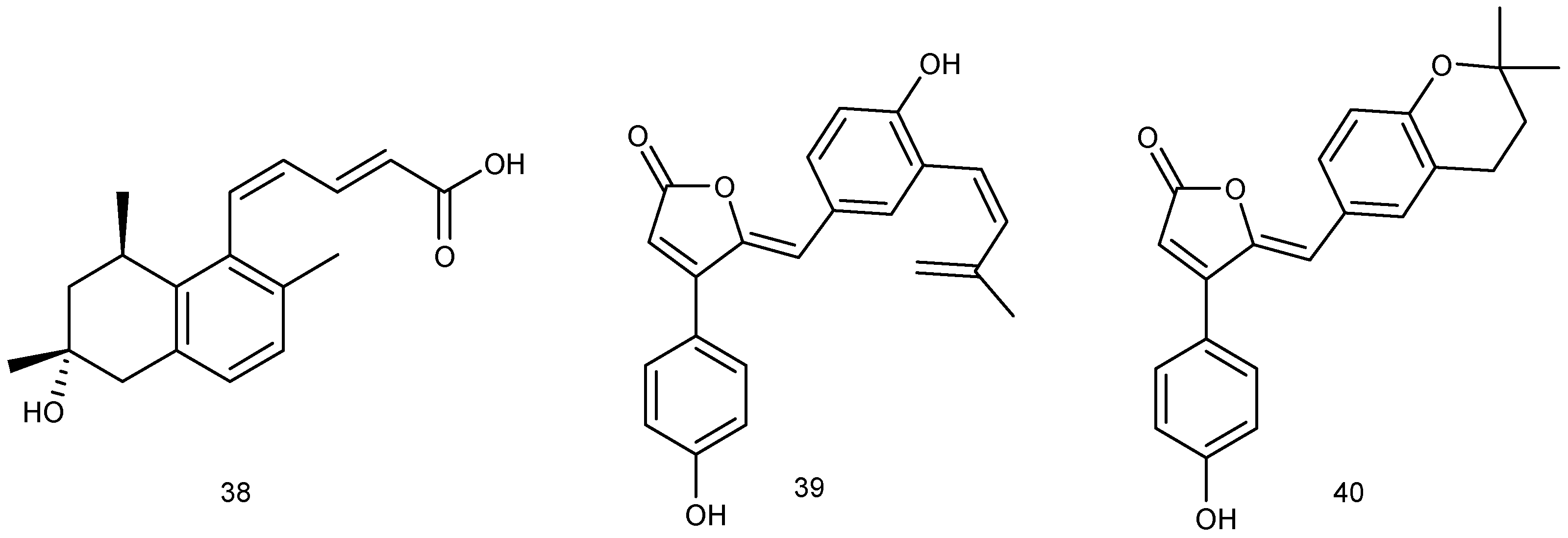 Two new rubrolides, rubrolides R (39) and S (40), were isolated from the fermentation broth of the marine-derived fungus Aspergillus terreus OUCMDZ-1925, which was isolated from the viscera of C. haematocheilus grown in the waters of the Yellow River Delta. Compound 39 showed comparable or superior antioxidation against ABTS radicals to those of trolox and ascorbic acid with an IC50 value of 1.33 μM. Compound 40 showed comparable or superior anti-influenza A (H1N1) virus activity to that of ribavirin with an IC50 value of 87.1 μM. Compounds 39 and 40 showed weak cytotoxicity against the K562 cell line with IC50 values of 12.8 and 10.9 μM, respectively, while were inactive against the A549, HL-60, Hela and HCT-116 cell lines (Figure 10) [27].