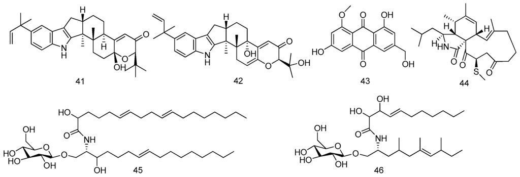Two new cerebrosides, penicillosides A (45) and B (46) were isolated from the marine-derived fungus Penicillium species, which were gained from the Red Sea tunicate, Didemnum species in the Mangrove. Penicilloside A displayed antifungal activity against Candida albicans while penicilloside B illustrated antibacterial activities against S. aureus and E. coli. Additionally, both compounds showed weak activity against HeLa cells (Figure 11) [31].