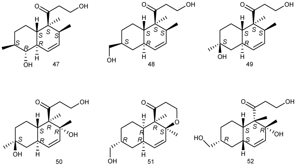 Six new compounds with polyketide decalin ring, peaurantiogriseols A–F (47–52), were isolated from the fermentation products of mangrove endophytic fungus Penicillium aurantiogriseum328#, which was collected from the bark of Hibiscus tiliaceus in the Qi’ao Mangrove Nature Reserve of Guangdong Province, China. Compounds 47–52, showed low inhibitory activity against human aldose reductase (at a concentration of 50 µM), the corresponding value of percent inhibitions were 16%, 6%, 31%, 22%, 26%, 2%, respectively (Figure 12) [32].