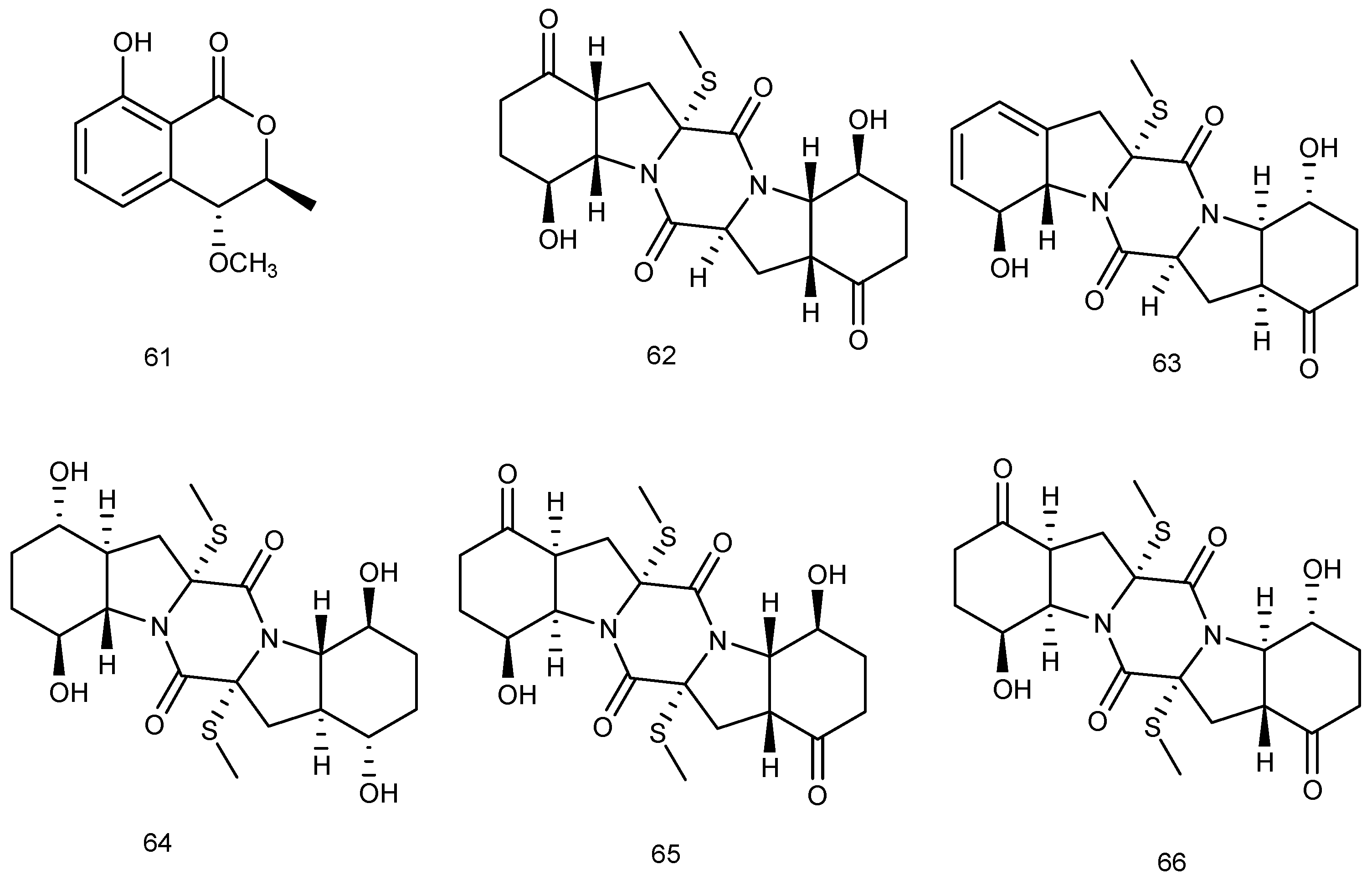 Penicillium brocae MA-231, an endophytic fungus, was obtained from the fresh tissue of the marine mangrove plant Avicennia marina. After investigation, five new sulfide diketopiperazine derivatives, namely, penicibrocazines A–E (62–66) were isolated and identified. In the antimicrobial experiments, compounds 63–65 showed activity against S. aureus, with MIC values of 32.0, 0.25 and 8.0 μg/mL, respectively. Compound 64 also showed activity against Micrococcus luteus with MIC value of 0.25 μg/mL. Moreover, compounds 63, 65 and 66 implied activity against plant pathogen Gaeumannomyces graminis with MIC values of 0.25, 8.0, and 0.25 μg/mL, respectively (Figure 14) [38].