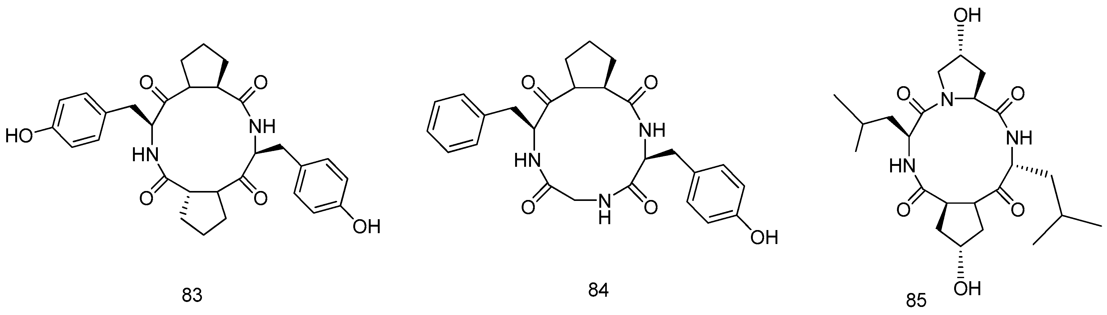 The strategy that co-cultivation of two mangrove fungi, Phomopsis sp. K38 and Alternaria sp. E33 (Leizhou Peninsula, Guangdong Province, China) in a single confined environment generated new active natural products, including three new cyclic tetrapeptides, cyclo(d-Pro-l-Tyr-l-Pro-l-Tyr) (83), cyclo(Gly-l-Phe-l-Pro-l-Tyr) (84) and cyclo(l-leucyl-trans-4-hydroxy-l-prolyl-d-leucyl-trans-4-hydroxy-l-proline) (85). Compounds 83–85 showed moderate to high antifungal activities (Candida albicans, Gaeumannomyces graminis, Rhzioctonia cerealis, Helminthosporium sativum and Fusarium graminearum) as compared with the positive control (Figure 18) [48,49].