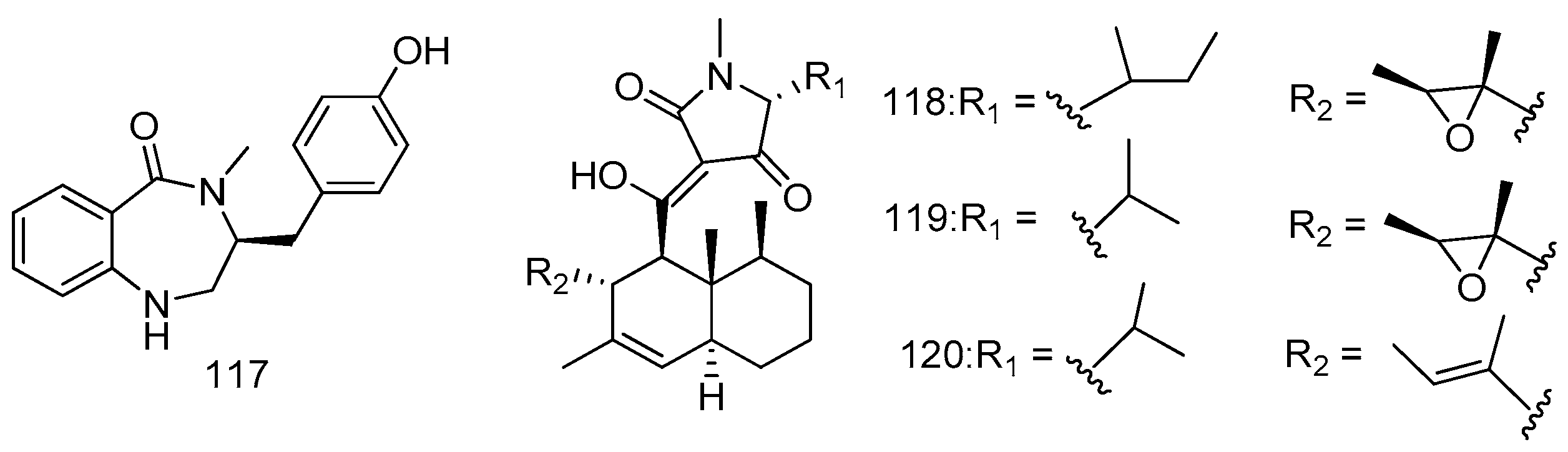 - Zhang, P.; Li, X.; Wang, J.; Wang, B. Oxepine-containing diketopiperazine alkaloids from the algal-derived endophytic fungus Paecilomyces variotii EN-291. Helv. Chim. Acta 2015, 98, 800–804. [Google Scholar] [CrossRef]