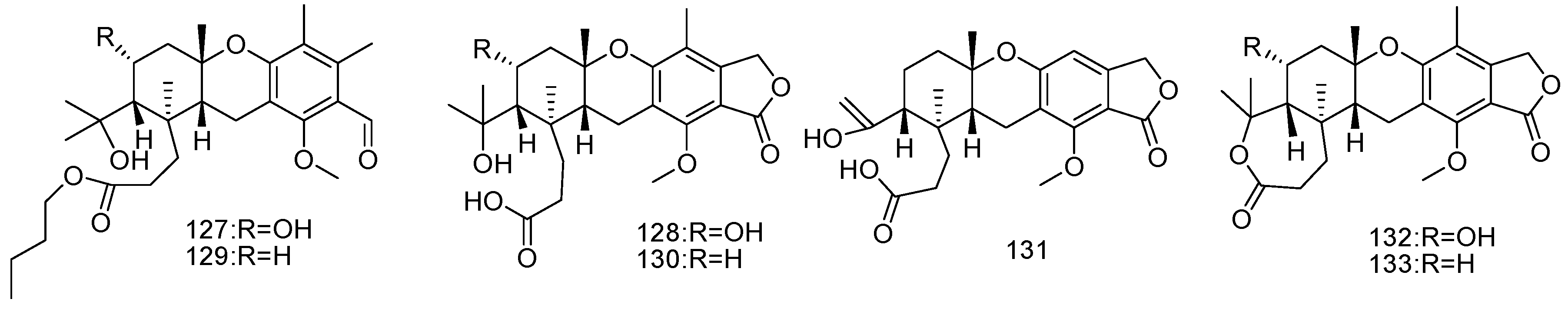 - Li, J.; Yang, X.; Lin, Y.; Yuan, J.; Lu, Y.; Zhu, X.; Li, J.; Li, M.; Lin, Y.; He, J.; Liu, L. Meroterpenes and azaphilones from marine mangrove endophytic fungus Penicillium 303#. Fitoterapia 2014, 97, 241–246. [Google Scholar] [PubMed]
