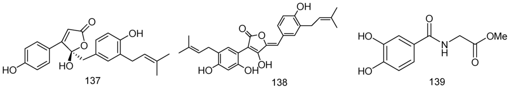 Investigation of the marine mangrove-derived fungal strain Penicillium sp. MA-37 resulted in the isolation of one new benzophenone, iso-monodictyphenone (69) and two new diphenyl ether derivatives penikellides A (70) and B (71). Compounds 69–71 exhibited brine shrimp lethality, with LD50 values of 25.3, 14.2 and 39.2 μM, respectively, while the positive control colchicine had LD50 value of 1.22 μM. Compound 69 showed antibacterial activity against Aeromonas hydrophilia with MIC 8 μg/mL, while the positive control, chloromycetin exhibited a MIC of 4 μg/mL (Figure 15) [40].