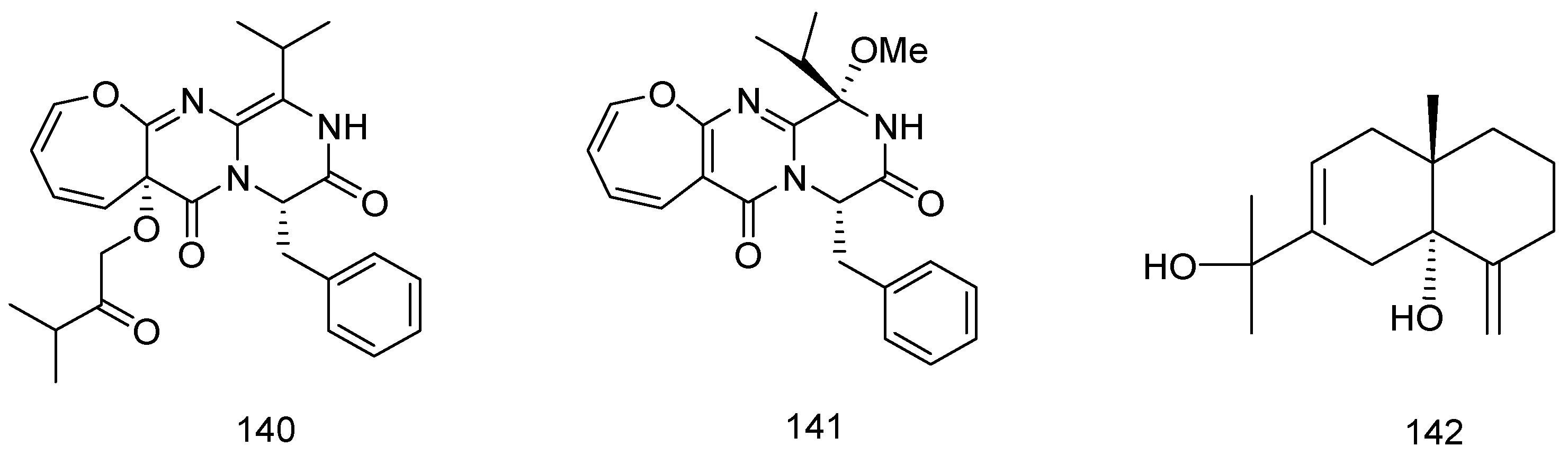 - Liang, W.; Le, X.; Li, H.; Yang, X.; Chen, J.; Xu, J.; Liu, H.; Wang, L.; Wang, K.; Hu, K.; et al. Exploring the chemodiversity and biological activities of the secondary metabolites from the marine fungus Neosartorya Pseudofischeri. Mar. Drugs 2014, 12, 5657–5676. [Google Scholar] [CrossRef] [PubMed]
