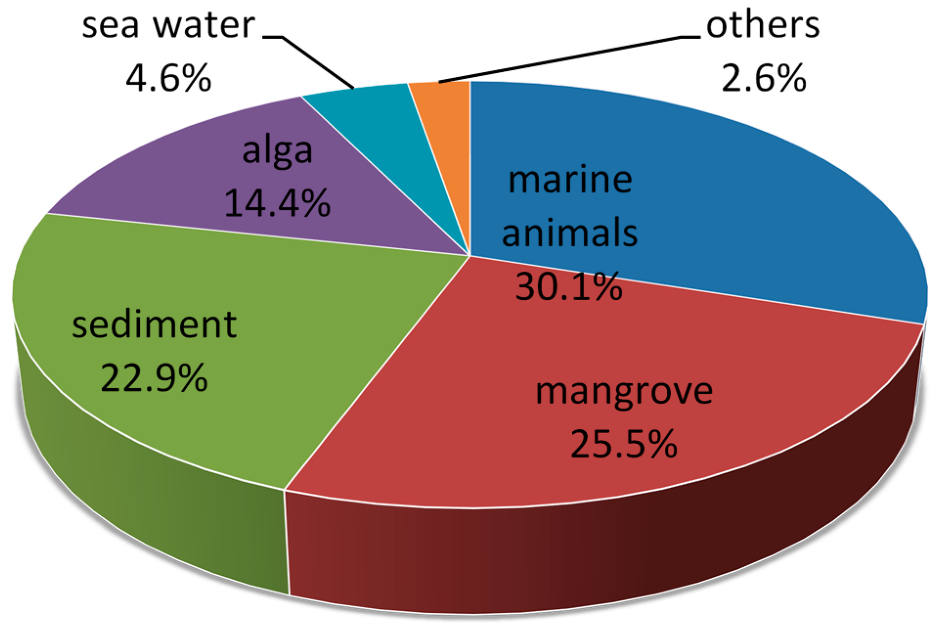According to a classical definition, marine fungi are divided into obligate marine fungi and facultative marine fungi [6]. In fact, marine fungi often live as symbionts in algae, mangrove, coral, sea anemone, starfish, sea urchin, seagrass, and, especially, sponges. Collection of marine fungi usually requires the collection of the host or supporting material (e.g., algae, marine invertebrates, sediment or water, and even driftwood). Herein, a neutral term “marine-derived fungi” was used, which includes any fungal strain obtained from marine environment using cultivation techniques with “marine” media, which do not differentiate between facultative marine strains and contaminants from terrestrial habitats.