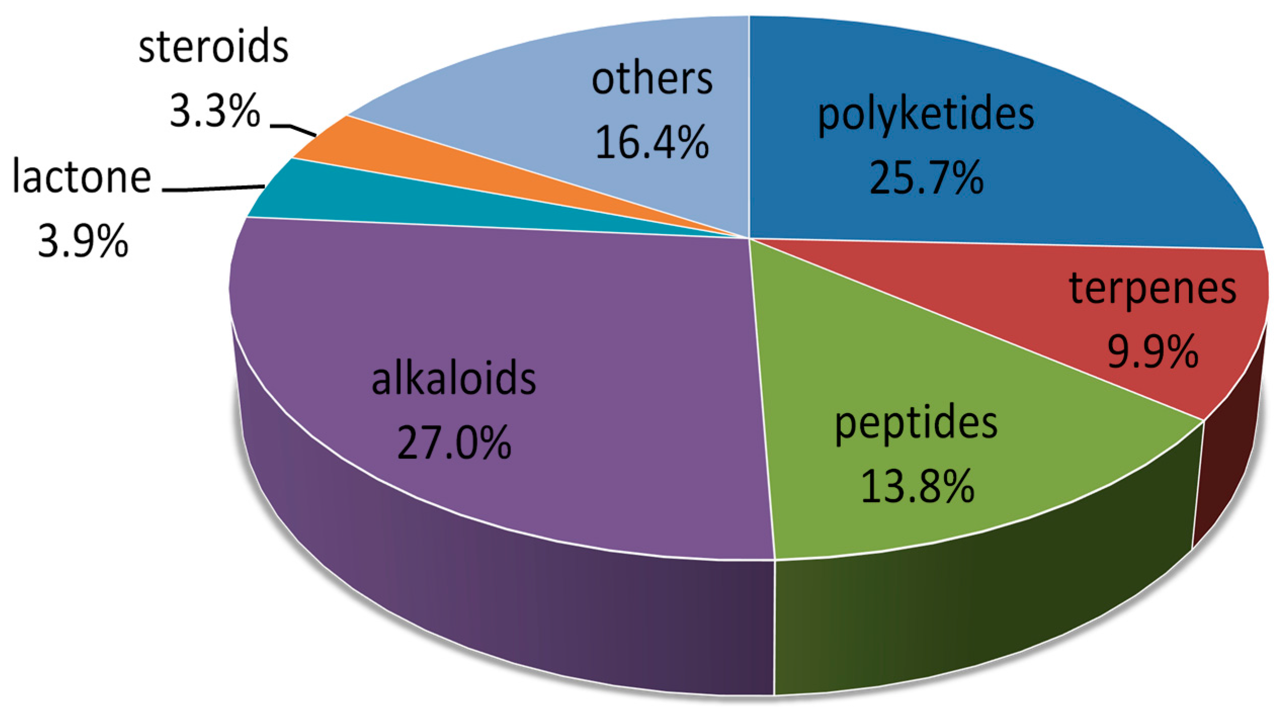 The oceans, which cover more than 70% of the earth’s surface and more than 95% of the earth’s biosphere, harbor various marine organisms. Because of the special physical and chemical conditions in the marine environment, almost every class of marine organism displays a variety of molecules with structurally unique features. However, unlike the long historical medical uses of terrestrial plants, marine organisms have a shorter history in pharmacological application [1]. In recent years, a significant number of novel metabolites with pharmacological potential have been discovered from marine organisms, such as polyketides, alkaloids, peptides, proteins, lipids, shikimates, glycosides, isoprenoids and hybrids, which exhibit biological activity including anticancer, antitumor, antiproliferative, antimicrotubule, cytotoxic, photo protective, as well as antibiotic and antifouling properties [2]. Among them, marine microorganisms, such as bacteria, actinomycetes, fungi and cyanobacteria have attracted more attention as potential lead compound producers. In comparison to marine invertebrates, they are a renewable and a reproducible source, as they can be cultured and can even be envisaged as amazing microbial factories for natural products [3].