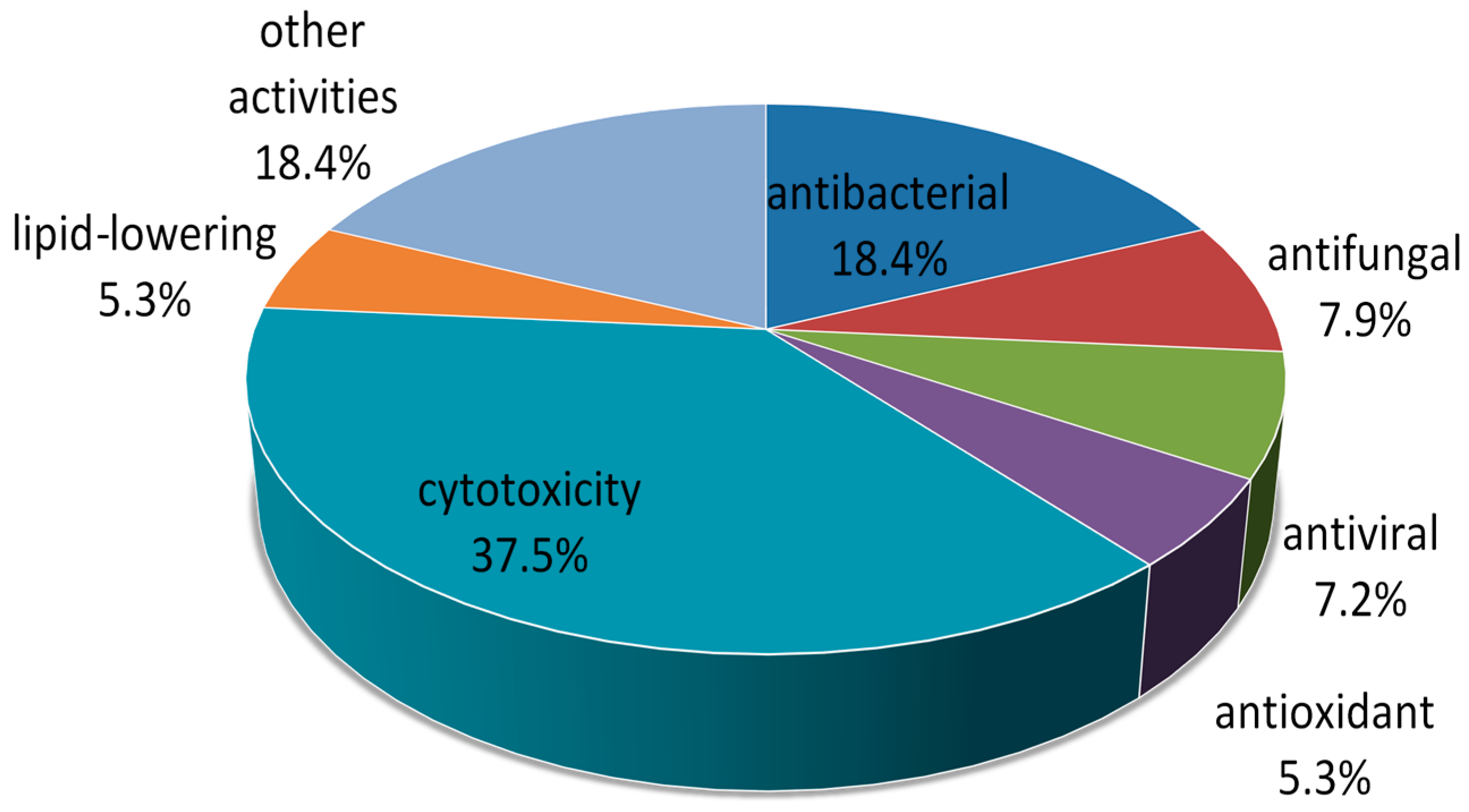 Despite the discovery of such important drug from marine fungi, the number of bioactive natural products originated from marine fungi increased extremely slowly. It is only from the late 1980s that researchers have focused on marine-derived fungi. In fact, marine-derived fungi are very important sources for novel bioactive secondary metabolites that could potentially be used as drugs. Blunt et al., mentioned that marine-derived fungi have a greater proportion of marine natural compounds with more desirable oral-bioavailability and physico-chemical properties with molecular weight (MW) < 400 and clogP (calculated octanol-water logP) < 4 [5]. Compounds that meet these criteria can suggest the optimum combinations for potential pharmaceuticals [5]. Currently, thousands of structurally unique and biologically active compounds have been reported from marine fungi.