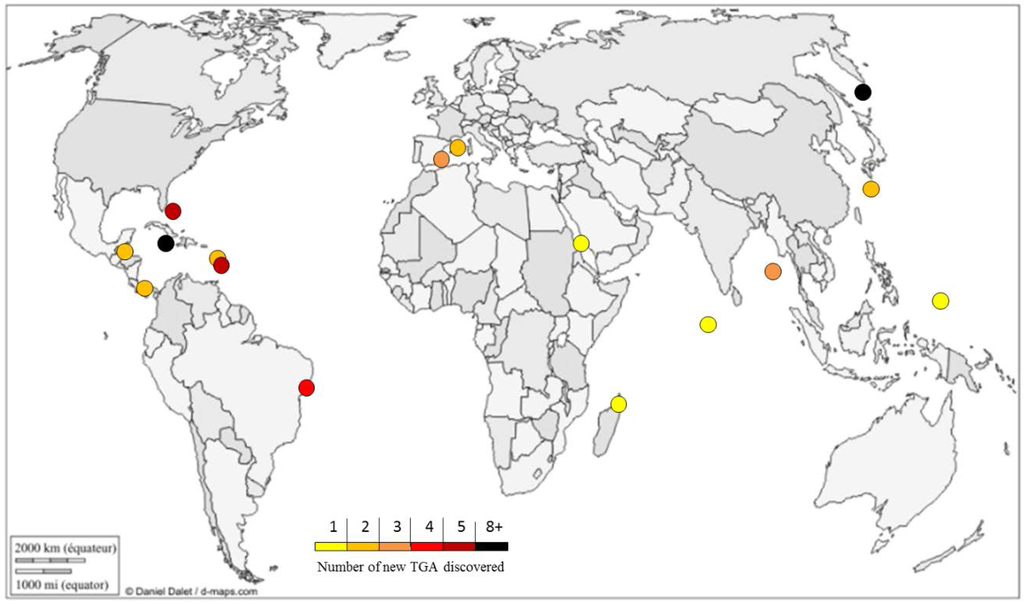 Geographical repartition of new TGA (triazaacenaphthylene guanidine alkaloids) discovered from 1989 to 2015. Graphic © d-maps.com [72]. Used with permission.