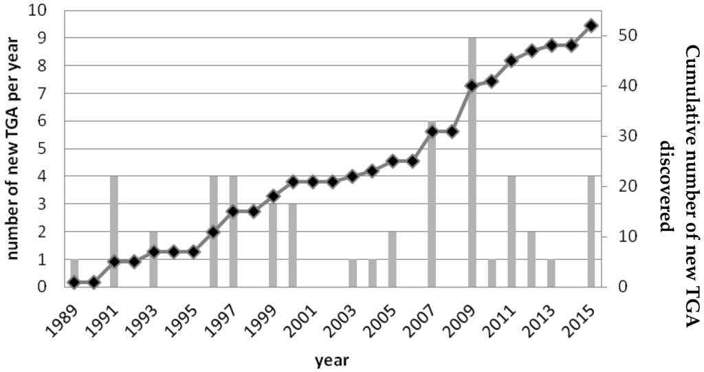 Since 1989, the number of new TGA discovered each year is considered as almost constant, although it should be noted that in some years no new TGA were described (Figure 2).