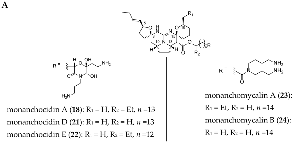 - Makarieva, T.N.; Tabakmaher, K.M.; Guzii, A.G.; Denisenko, V.A.; Dmitrenok, P.S.; Shubina, L.K.; Kuzmich, A.S.; Lee, H.S.; Stonik, V.A. Monanchocidins B–E: Polycyclic guanidine alkaloids with potent antileukemic activities from the sponge Monanchora pulchra. J. Nat. Prod. 2011, 74, 1952–1958. [Google Scholar] [CrossRef] [PubMed]