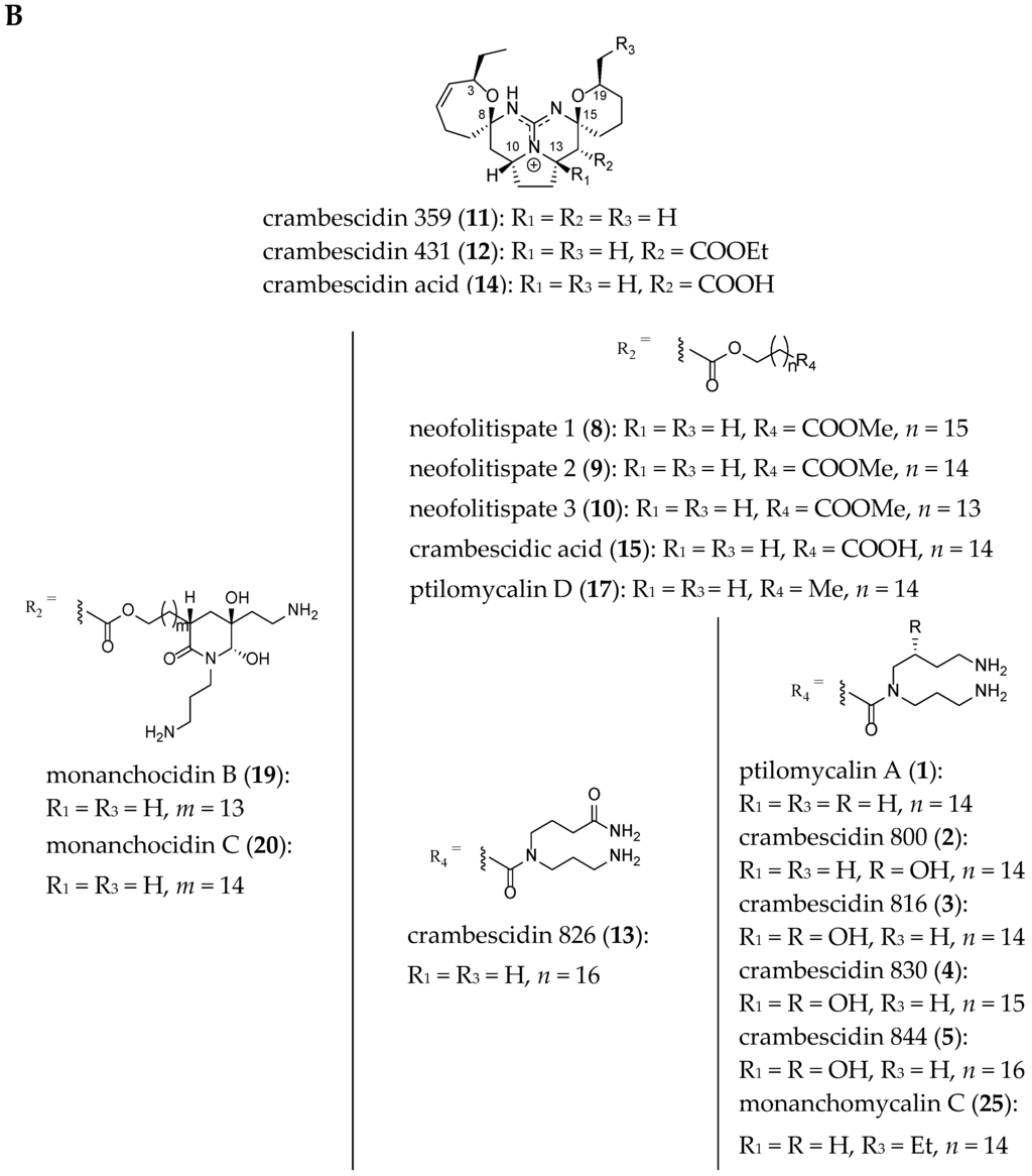 - Palagiano, E.; De Marino, S.; Minale, L.; Riccio, R.; Zollo, F. Ptilomycalin A, crambescidin 800 and related new highly cytotoxic guanidine alkaloids from the starfishes Fromia monilis and Celerina heffernani. Tetrahedron 1995, 51, 3675–3682. [Google Scholar] [CrossRef]