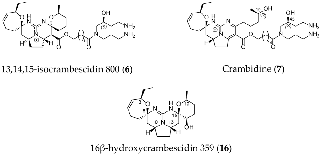 Other derivatives such as 13,14,15-isocrambescidin 800 (6), crambidin (7) or 16β-hydroxycrambescidin 359 (16) have also been isolated (Figure 4).