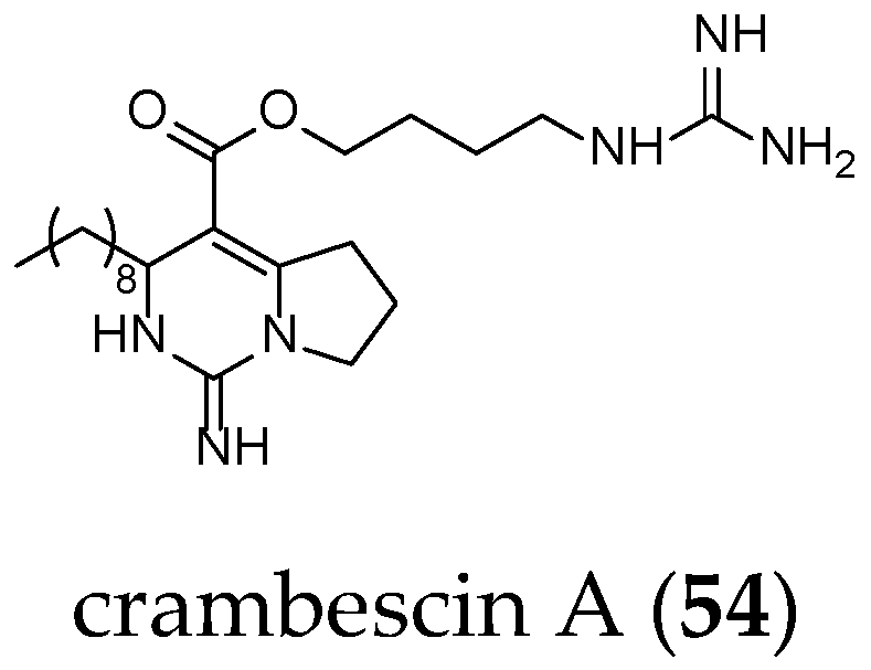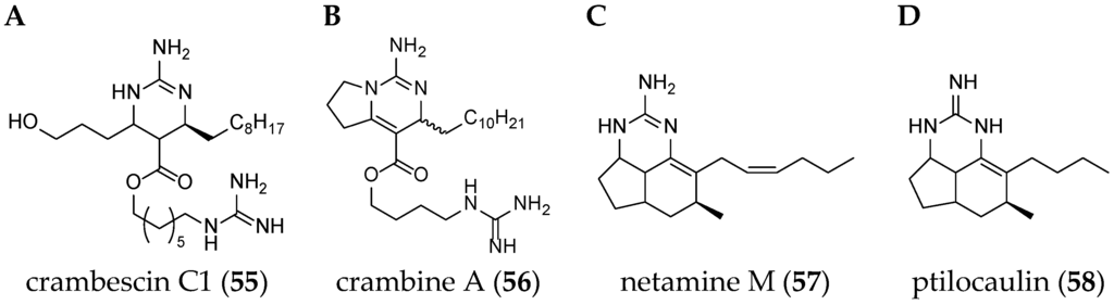Different guanidine alkaloids classifications can be made, and, as such, Santos et al. (2015) have described four GA chemotypes [70]. The first class is constituted of a monocyclic pyrimidinamine skeleton, for example, crambescin C1 (55) or the bicyclic cyclopentapyrimidinamine skeleton, such as crambine A (56) (Figure 8). The second one is a tricyclic triazaacenaphthylene skeleton, which only contains one guanidine moiety like crambescidins, and the third one possess the same skeleton as for class 2, but contains, at least, one more guanidine moiety, as can be seen in the case of most batzelladines. The fourth one is a tricyclic cyclopentaquinazolinamine skeleton like netamine M (57) or ptilocaulin (58).