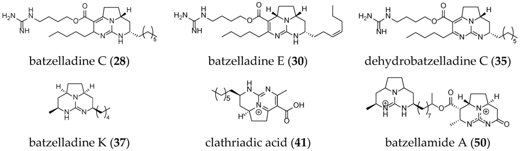 Other batzelladine-like GA have been isolated such as batzelladine C (28), K (37), and E (30); dehydrobatzelladine C (35); clathriadic acid (41); and batzellamide A (50) (Figure 7).