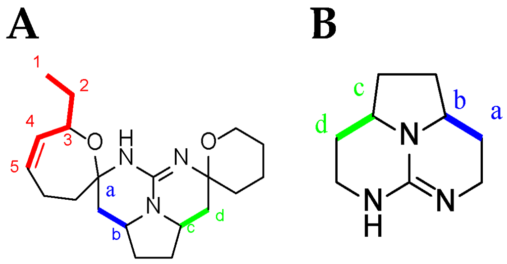 - Braekman, J.C.; Daloze, D.; Tavares, R.; Hajdu, E.; Van Soest, R.W.M. Novel polycyclic guanidine alkaloids from two marine sponges of the genus Monanchora. J. Nat. Prod. 2000, 63, 193–196. [Google Scholar] [CrossRef] [PubMed]