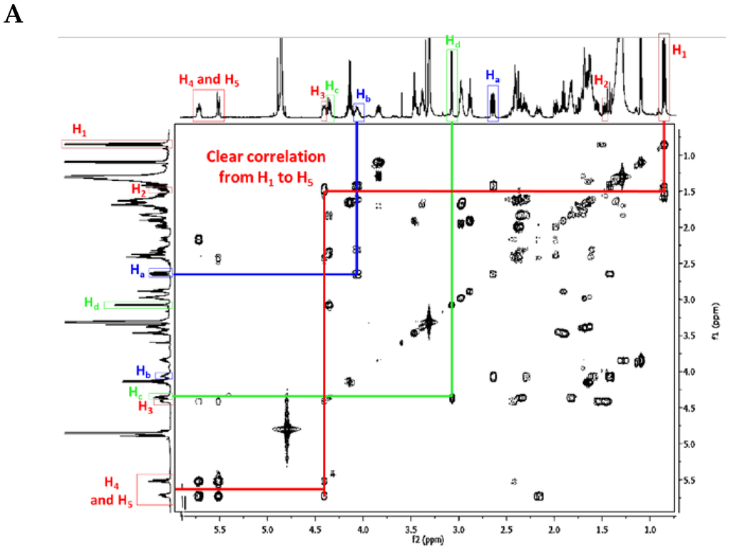 TGA NMR spectra have a high content of information. Due to the relative signal richness, the 1H–1H COSY experiment is appropriate in helping to find whether one or another TGA class is present by analyzing the NMR spectra between 0.8 and 5 ppm. Nonetheless, several characteristic signals from different atoms listed below (Figure 9) should be found in the 1H NMR spectra (Table 4).